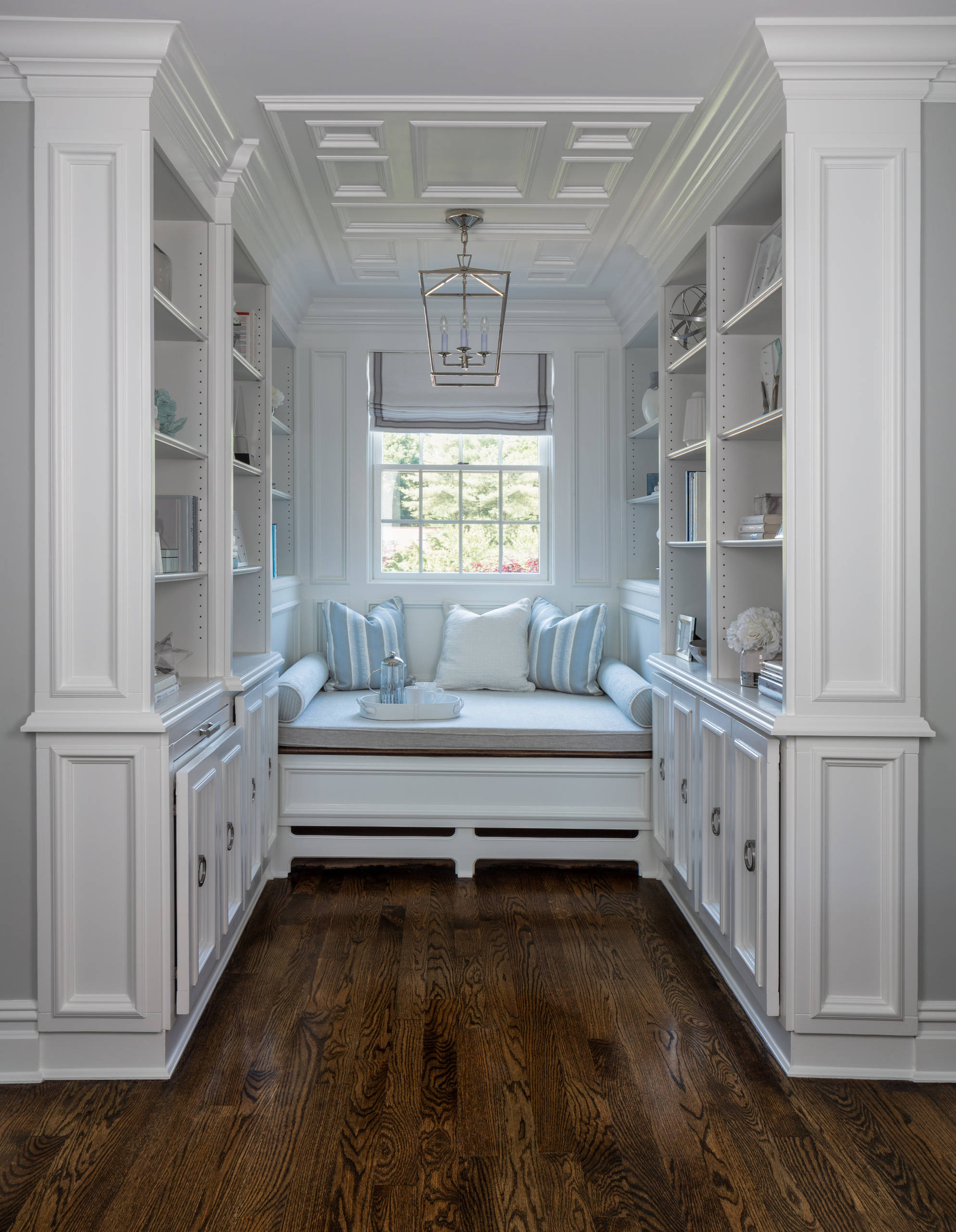After: Campana created a reading nook by adding custom built-ins with grasscloth-backed display shelves, a deep window seat and ceiling millwork. A pull-out desktop on one of the cabinets gives Miller a spot to work on her laptop. “This is my favorite spot,” Campana says. “It’s like being tucked away and having a place to relax and enjoy all their photos and views of the beautiful backyard.”