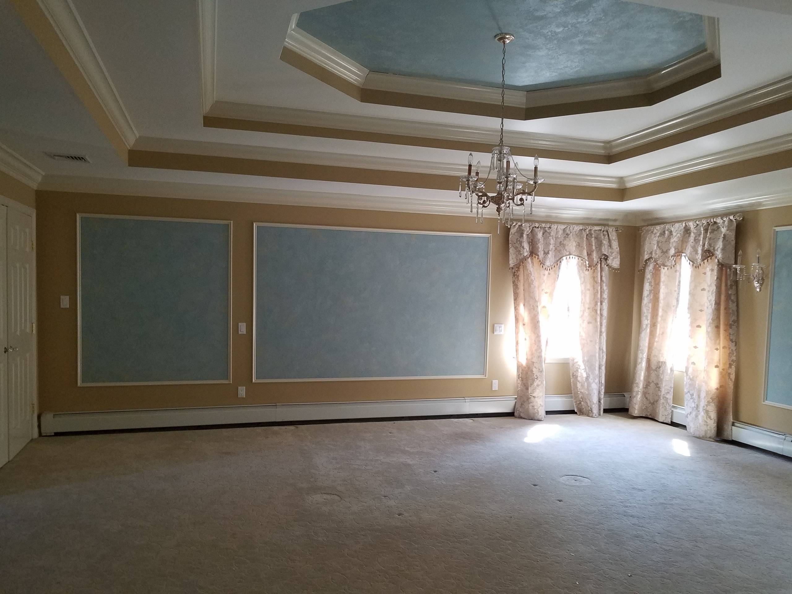A European ballroom is a fine place to hold a lavish party. But no one wants to sleep in one. Victor Bruno and his wife, Laura Miller, faced that dilemma with their Long Island, New York, master bedroom. A stacked-tray ceiling and wall panels painted to look like clouds in a blue sky set amid a backdrop of gold-colored walls didn’t exactly leave them twirling.