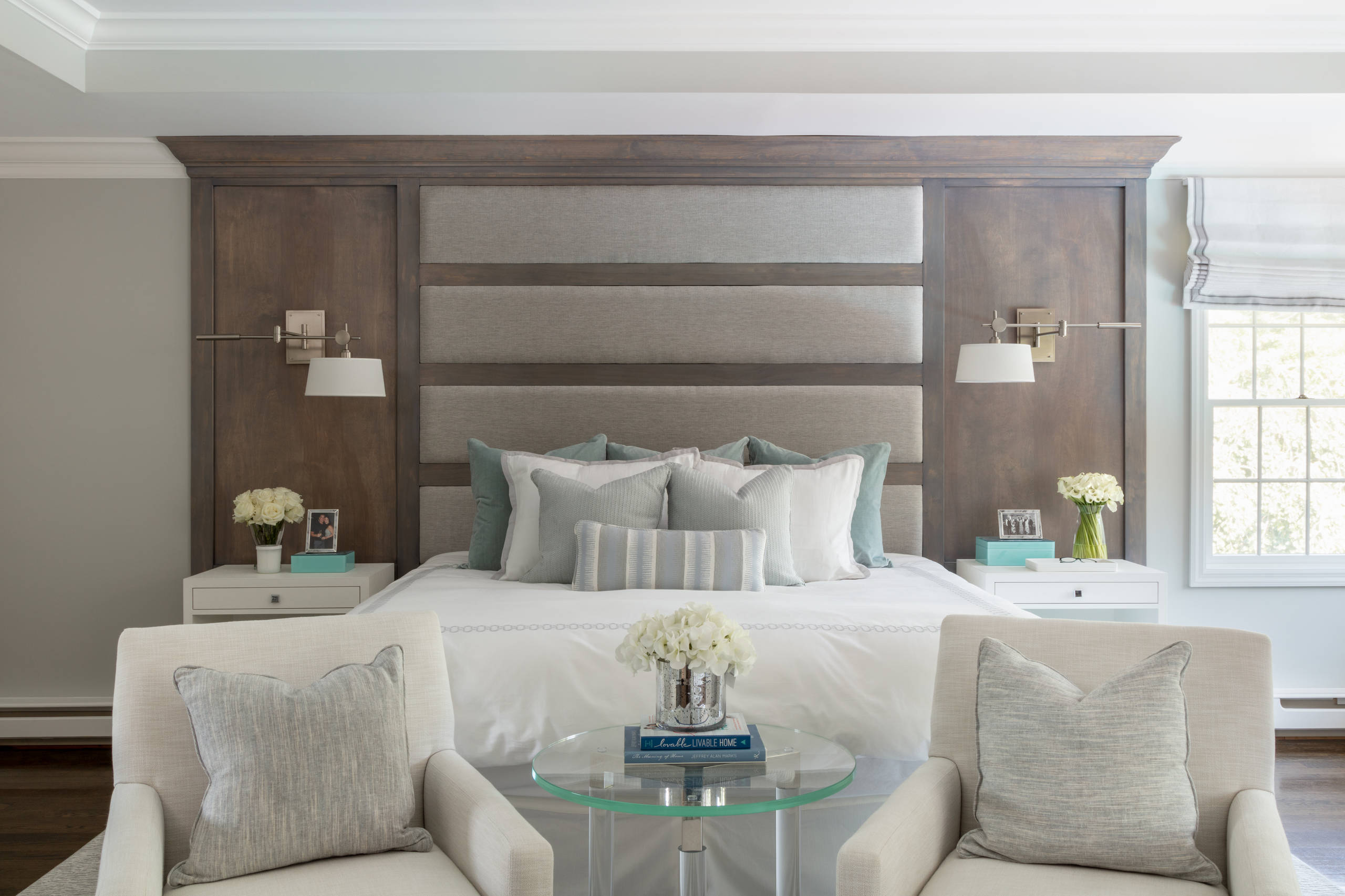 A custom-designed floor-to-ceiling wood headboard in a grain stain and with upholstered gray chenille panels resembles headboards Miller has seen in hotels during frequent trips as a business executive. “For me, this headboard enables a much more fluid transition for this bedroom with a reading or seating area,” she says. “It enables the bed to become part of the room.”