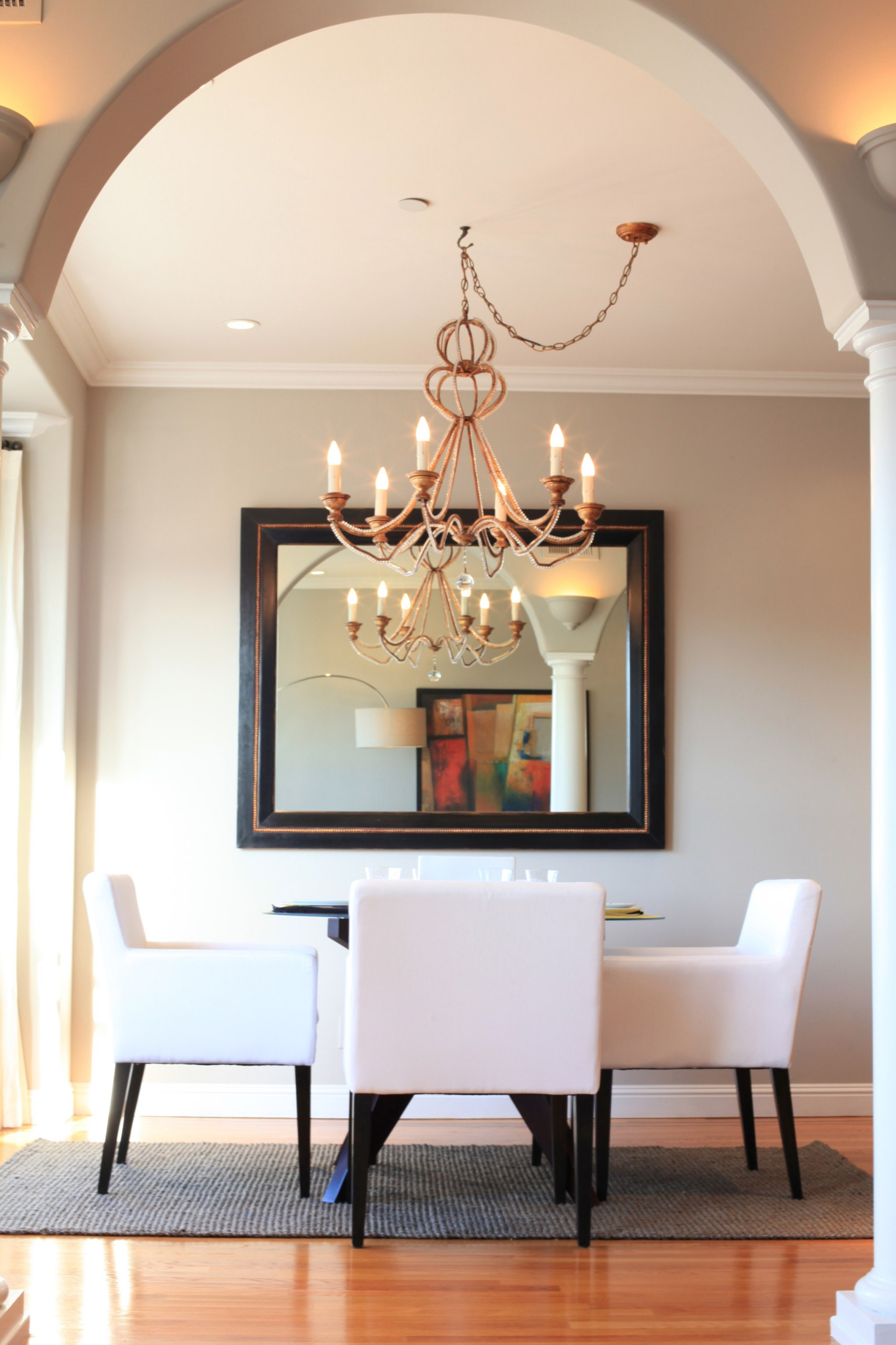 3. Mirror, mirror on the wall. Who's the fairest one of all? Your room, that's who. Use mirrors liberally to make your area look bigger, lighter, brighter, and encourage sunlight to bounce all over the walls. In this small dining area, the mirror even adds color by reflecting the painting that's hanging in the living area. How's that for working double duty?