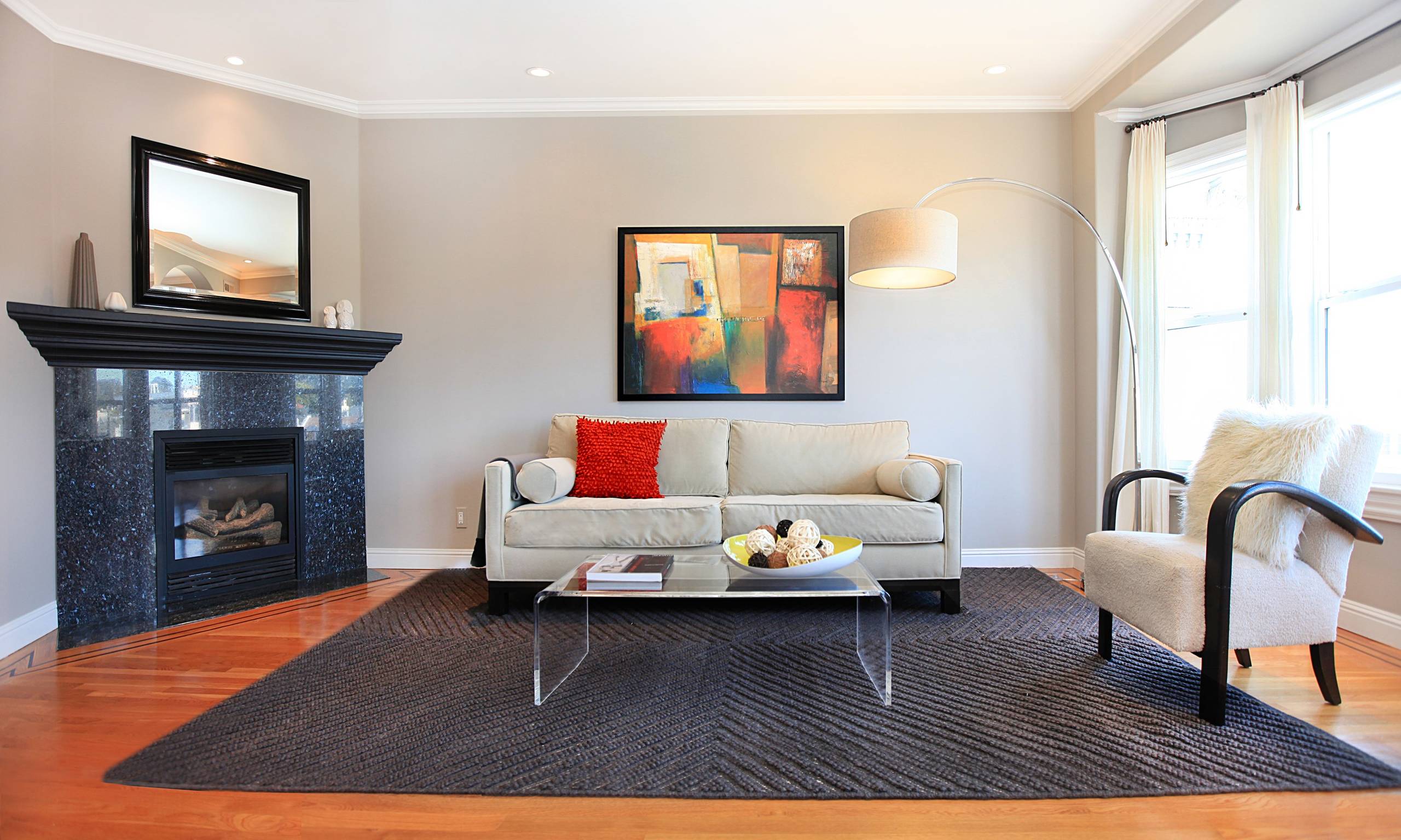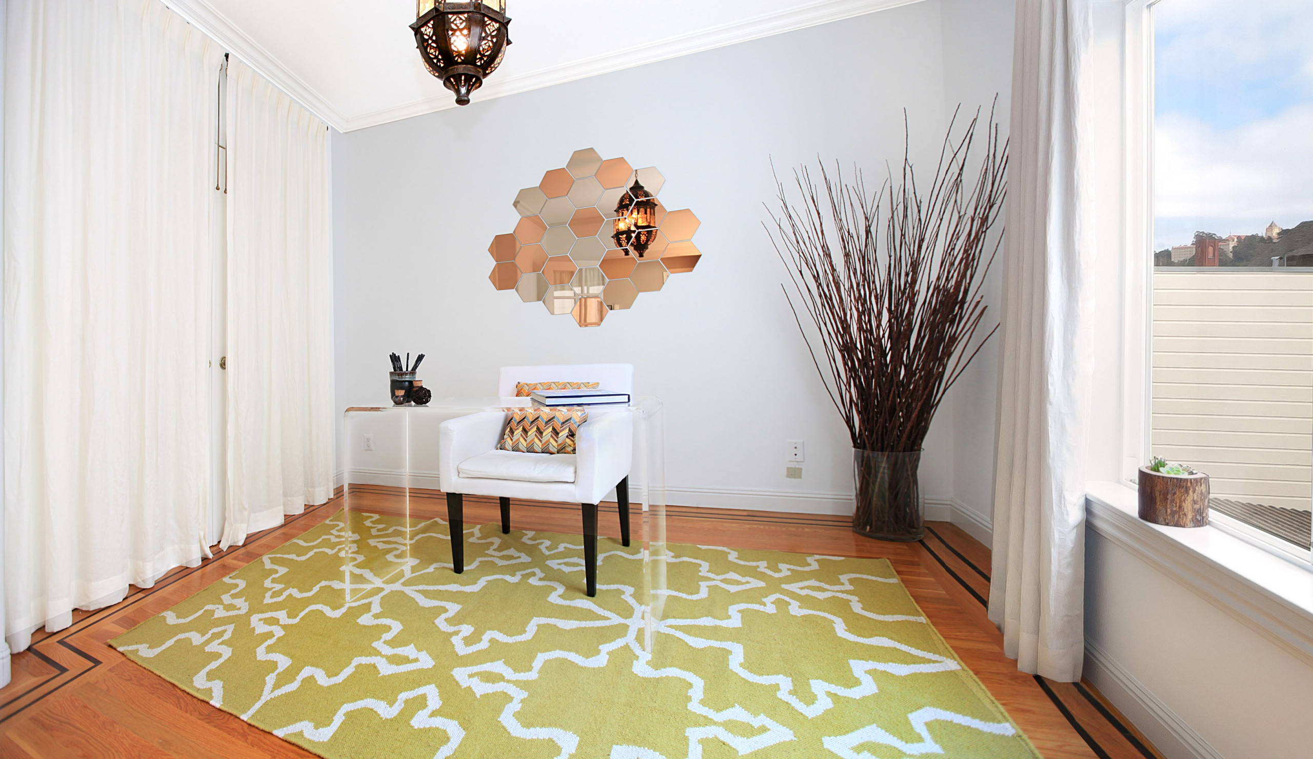 2. Freshen up the style. You may be a diehard Shabby Chic follower, but even Rachel Ashwell would agree that not everyone is. Aim for a style that most buyers would like, even if it's not your cup of tea. Furnishings that seem homey and comforting — yet fresh and contemporary — give an aura that your home is updated and well cared for. Neutrals work best; just add colorful touches here and there. For this home office, I used a bright rug to punch in some color and pattern to an otherwise boxy white room. The clear console stands in for a desk (if buyers saw my real desk stacked with papers and dirty coffee mugs, they'd run for the hills). Curtains hide the closet doors and soften the hard walls. Stick-on mirrors from IKEA reflect light and space.