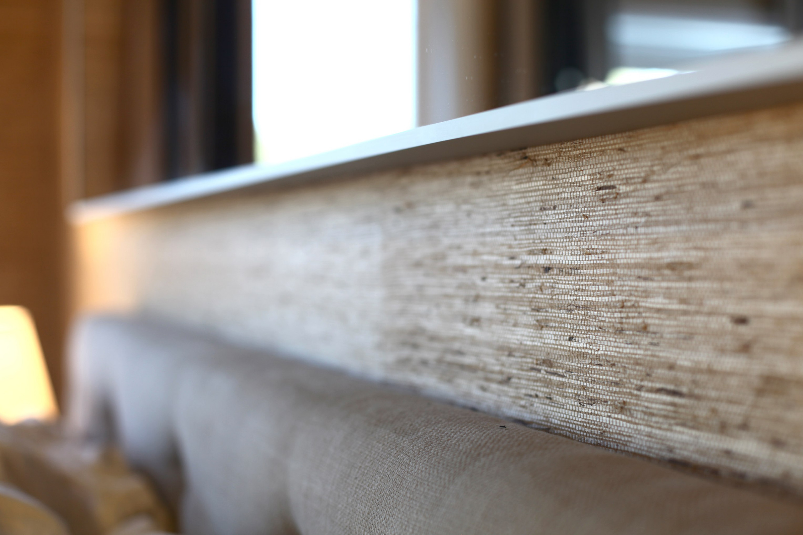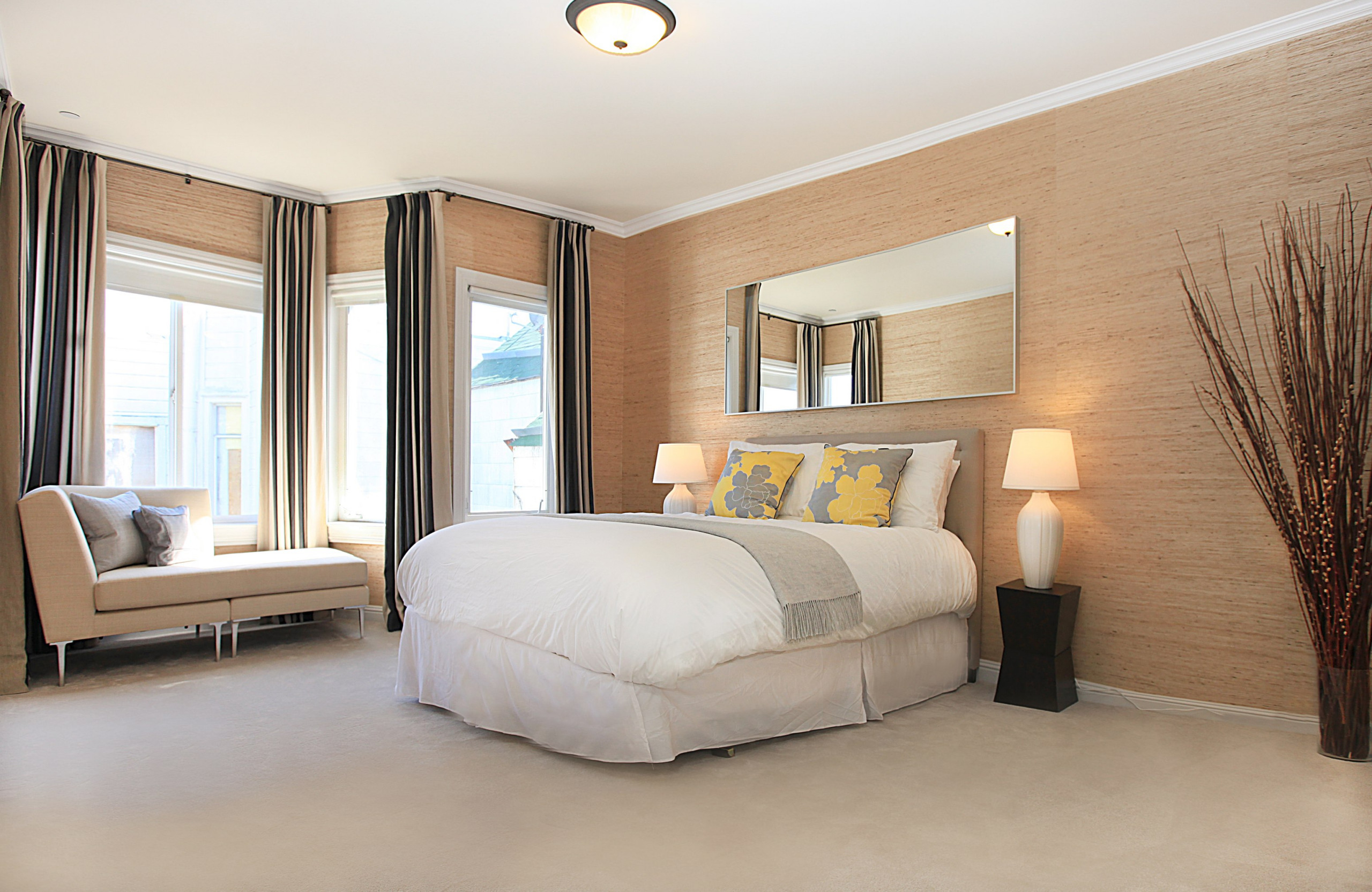 5. Play with texture. Wallpaper, pillows, rugs, blankets, baskets, and other tactile accessories can play up texture in a room. It's an easy way for anyone, even my colorblind husband, to add warmth to a blah room. Try grass cloth wallpaper on plain walls that need a little oomph, such as in this master bedroom, where buyers expect to see a little more luxury and style.