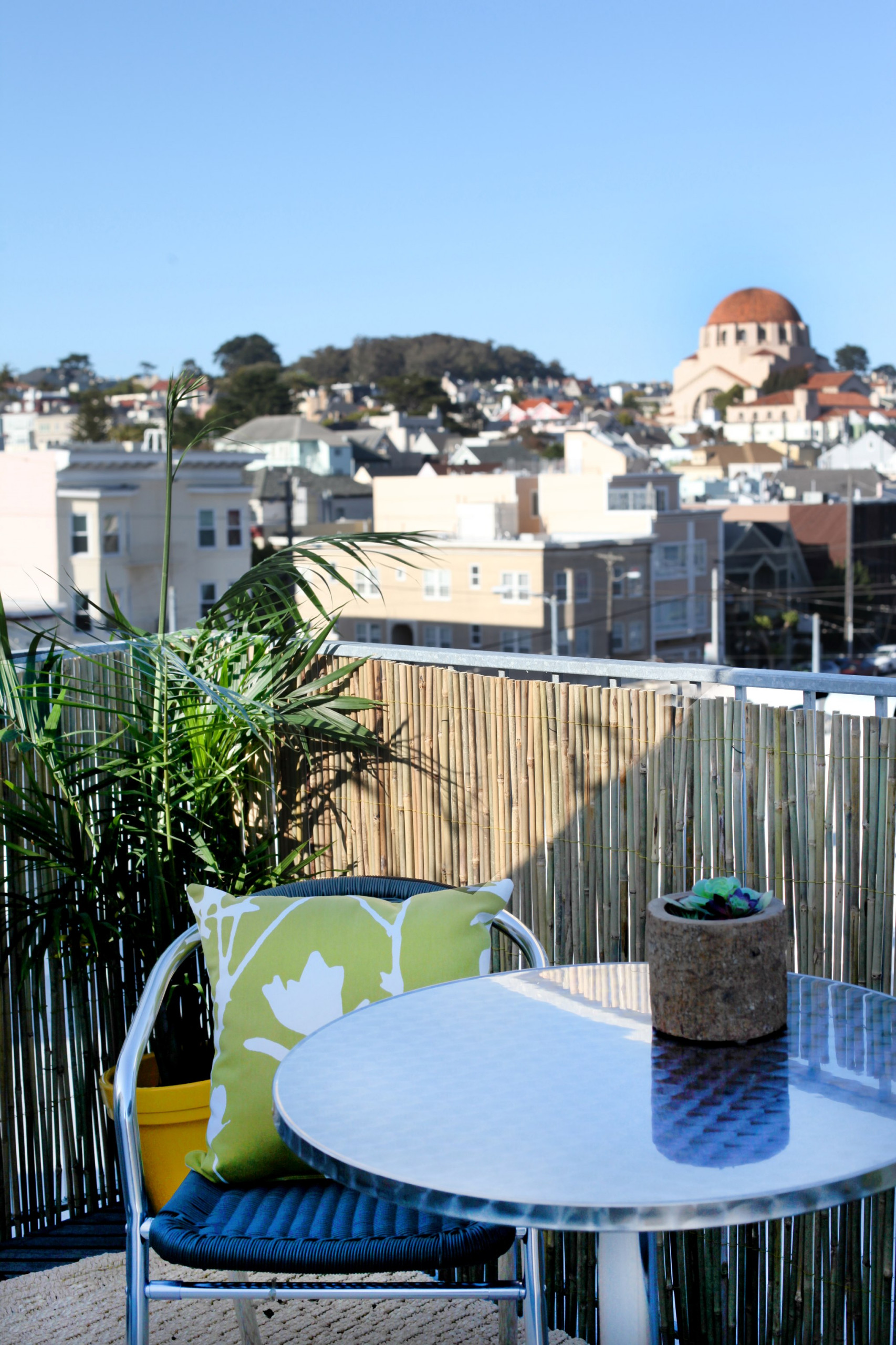9. Don't forget the outdoor areas. Those spaces add as much interest for the buyer as the interior rooms. For this unsightly roof deck, I added inexpensive bamboo sheeting to the rail, an outdoor rug, small table and bistro chairs, and a few plants. Now the buyers will see this formerly blank space as an additional living area. Bonus.