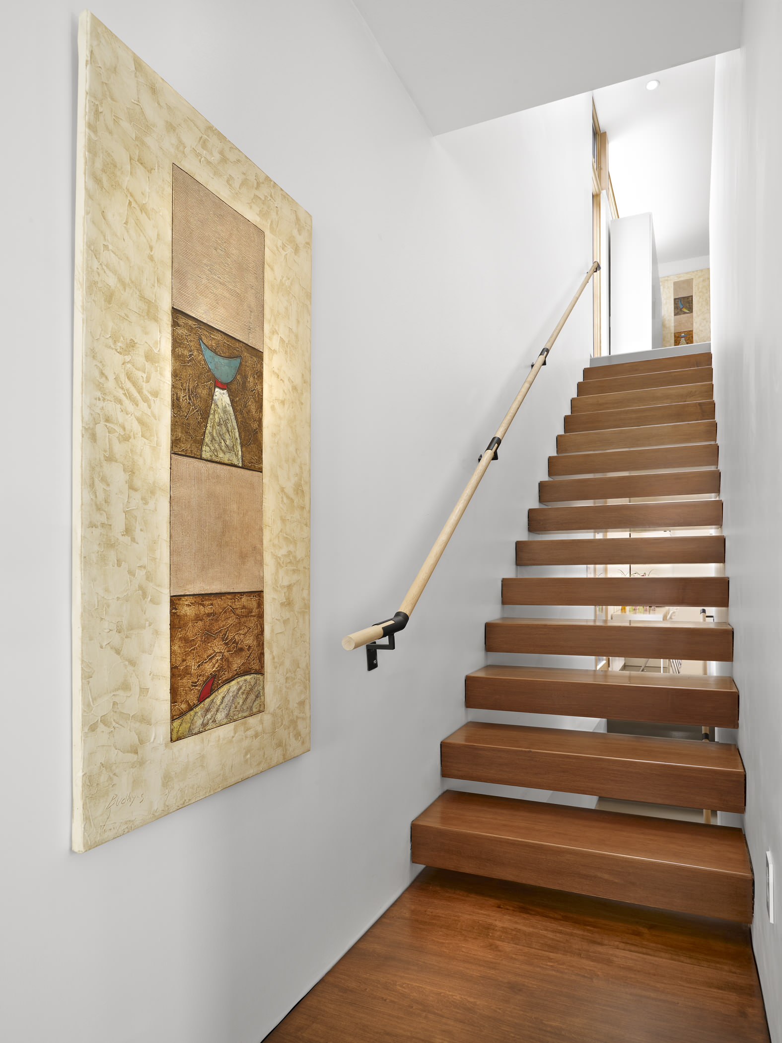 What's interesting in this stair is that the open risers are kept narrow, 4 inches or less, to comply with the local building code and still be open.
