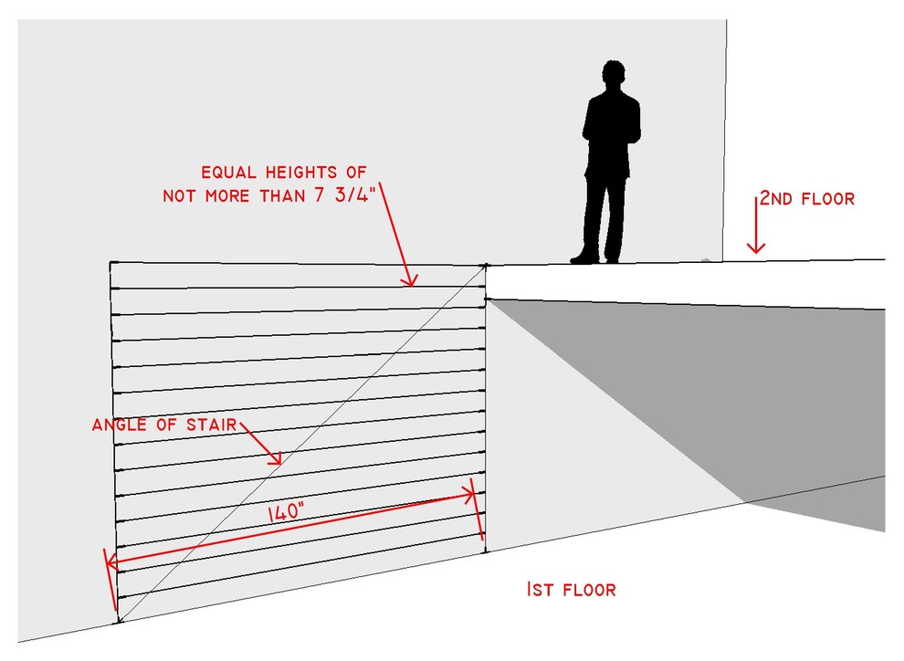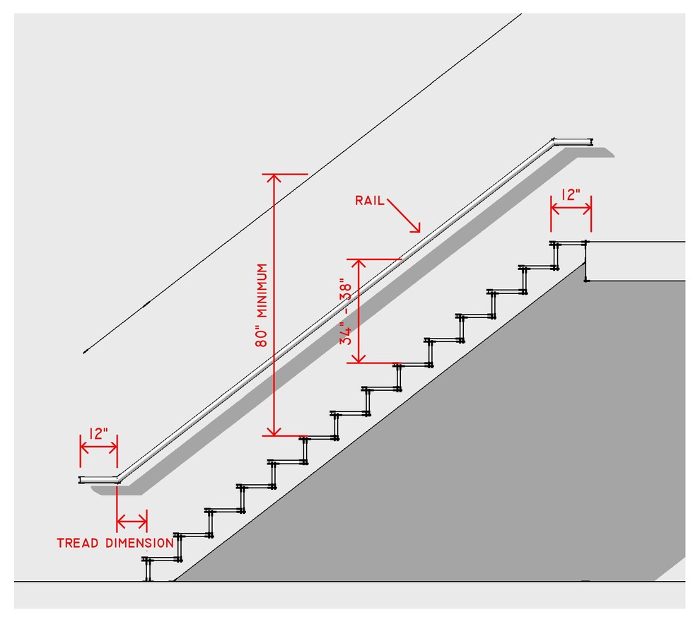 Specifically, the rail can't be more than 38 inches or less than 34 inches above a tread (or walking surface), and must be extended horizontally at the top and bottom.