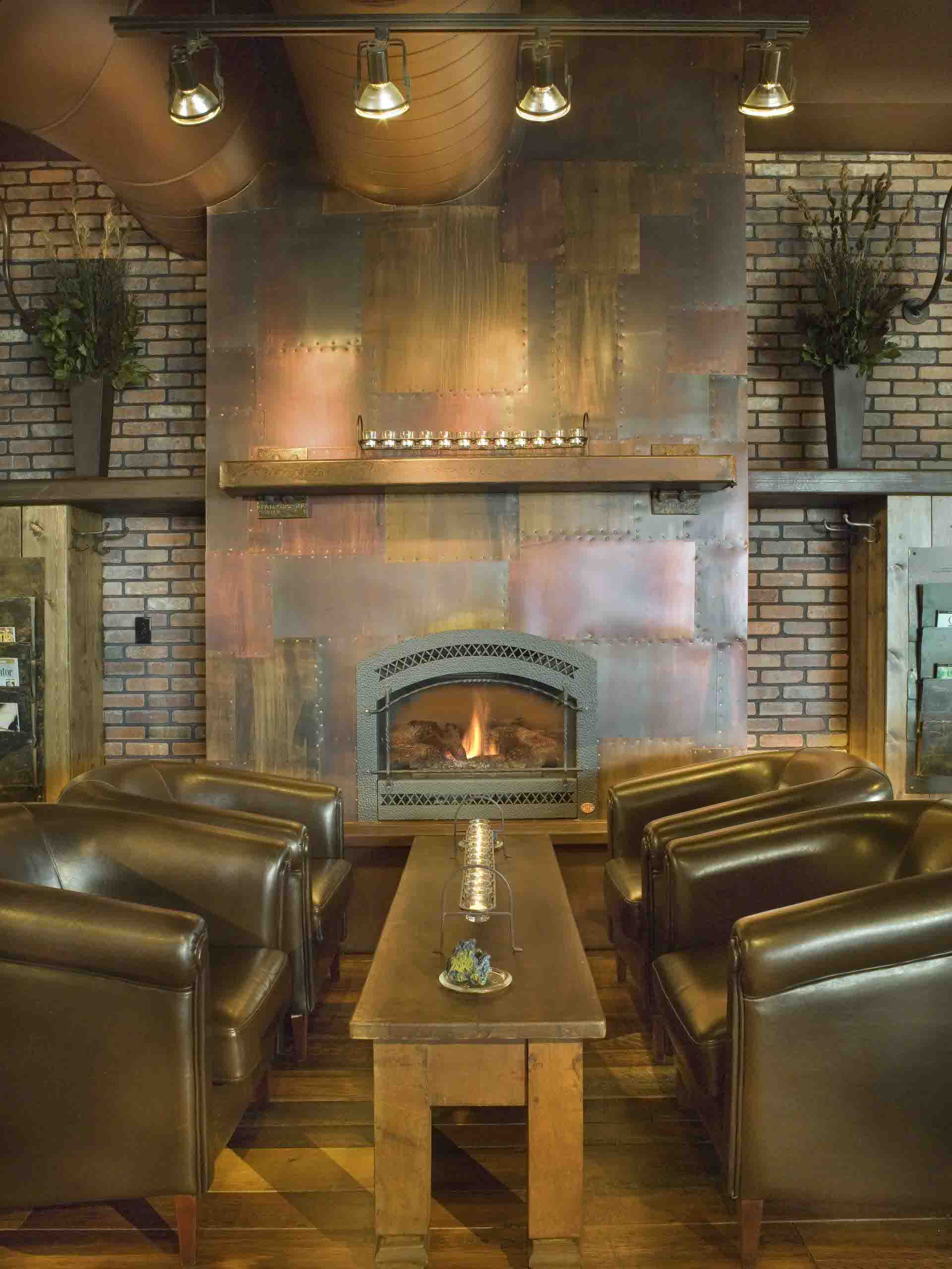 Black tiles create a neutral backdrop that lets the copper fixtures stand out.