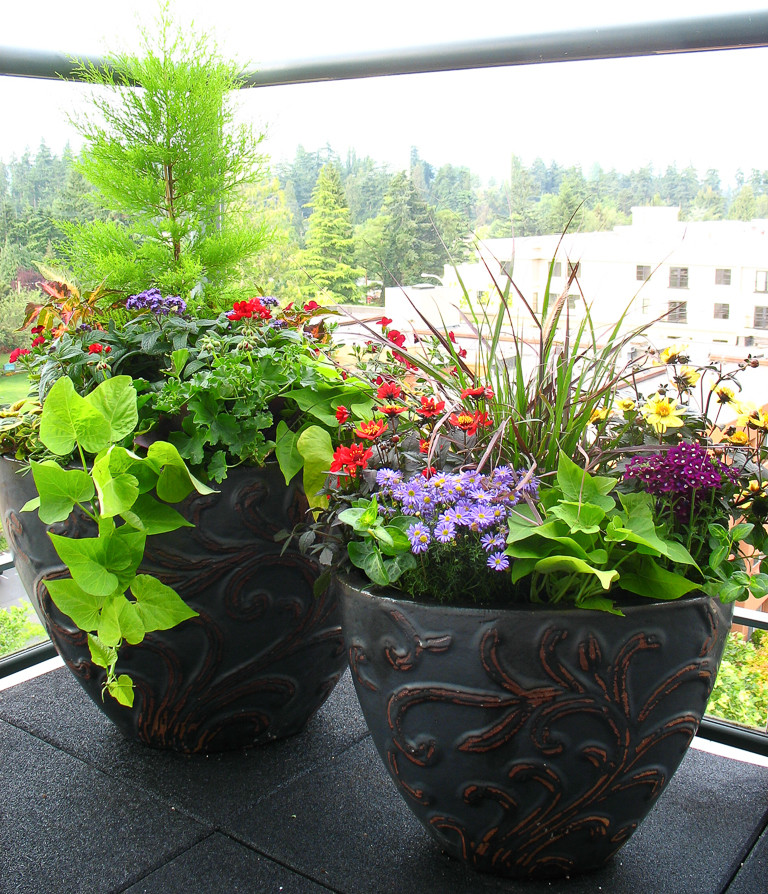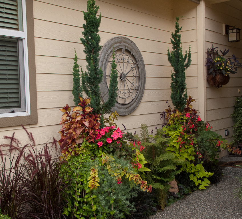 The narrow silhouette allows for plenty of additional plants at the base. Here the rich blue-green foliage is combined with the exciting colors and textures of coleus, autumnale fuchsia, sweet potato vine (Ipomoea batatas) and lotus vine (Lotus maculatus), with a blast of floral color provided by the hot-pink New Guinea impatiens.