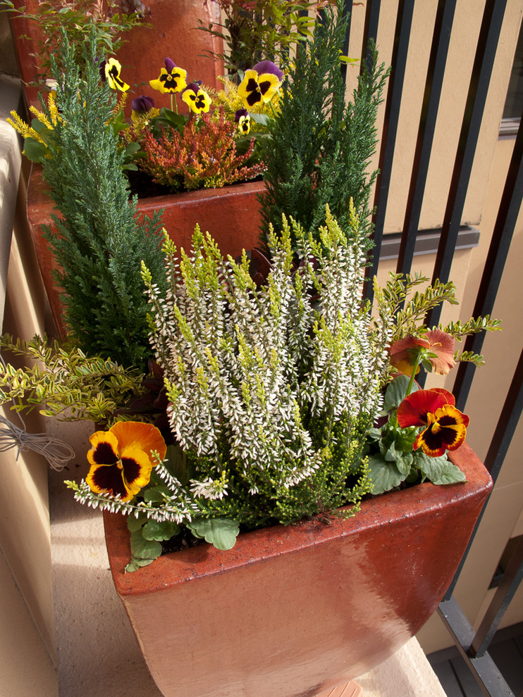 Fall sees the exchange of summer annuals for winter hardy evergreens and pansies and violas. The same purple, red and chartreuse color scheme is kept, as is the bold conifer.
