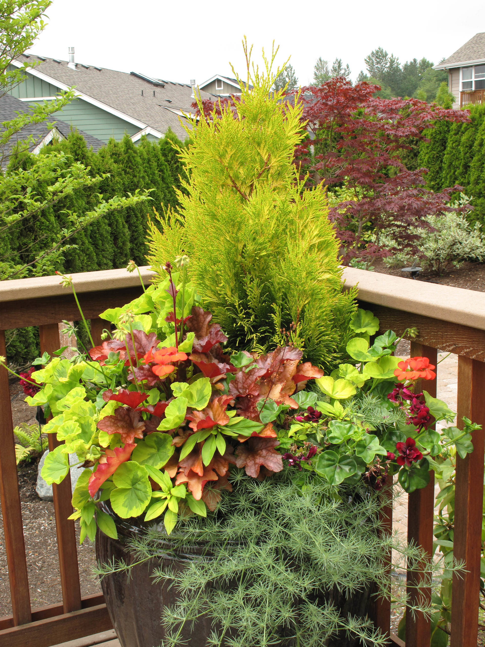 Both the juniper and arborvitae are suited to the edge of the container, where they soften the edge without actually trailing. This is a short container that isn’t suited for long, trailing plants anyway.