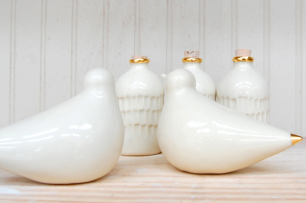 “I really like the idea of finding an existing form and then, when you cast it in porcelain, it’s a totally different thing,” says Hamill. The antler series was the first line she produced from her studio and is one of her favorites. From right to left, you can see the original antler before it’s been casted, then the bare porcelain form and the final product after it’s been fired again and glazed.