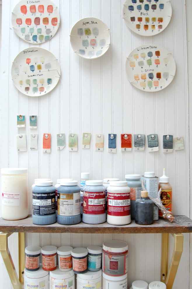 Hamill discovers new glazes and colors through trial and error, testing them on a few plates that she hangs on the wall. “You’re rewarded for your curiosity, but you have to have a pretty thick skin,” she says of the glazing process. Smaller strips of color, called test tiles, are displayed above a shelf.