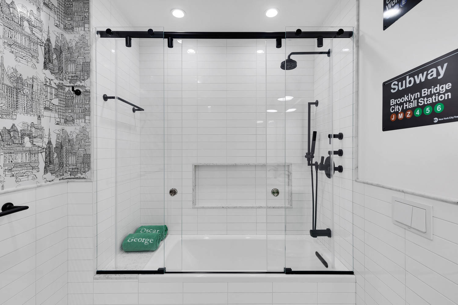 A pair of MTA subway station signs completes the urban theme of the room. I didn’t ask if they pipe in J.Lo’s album On the 6, but I would like to suggest it as the bathroom soundtrack.