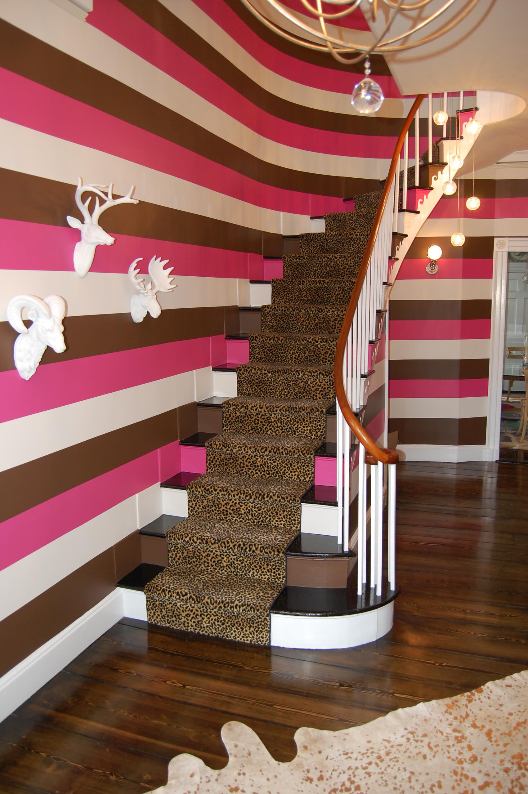This foyer gives each hue equal billing with bold stripes on a curved wall. Note the way each stripe lines up with the corresponding stair riser.
