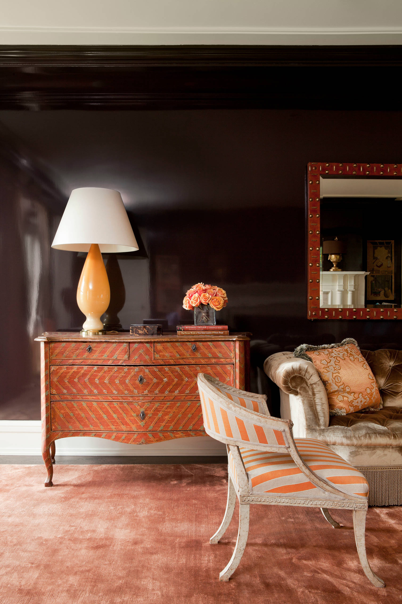Orange also adds zest to a room, particularly when the chocolate is in the form of a lacquer on the walls. This glossy backdrop lets the various shades of orange stand out.