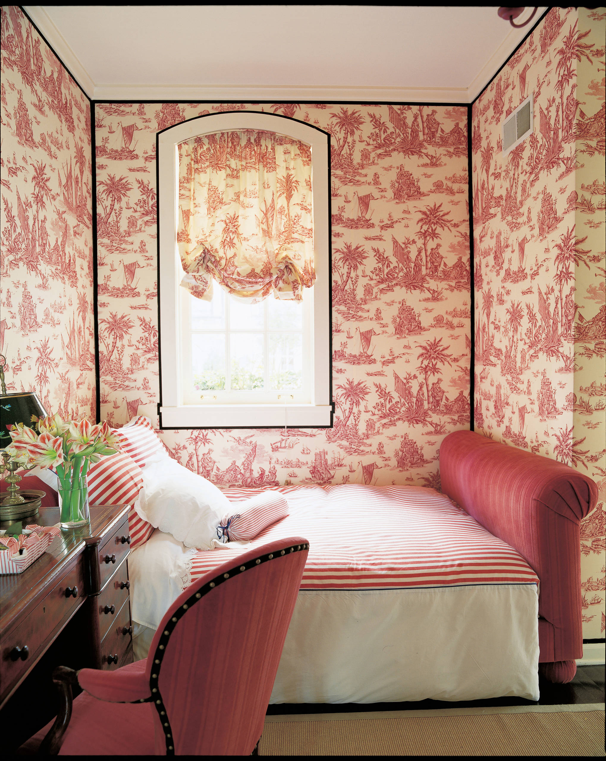 Here I’ve chosen an elegant room that honors Graeter’s French-pot process. Toile, velvet, wood accents and that smart dark outline take the colors to elegant heights.