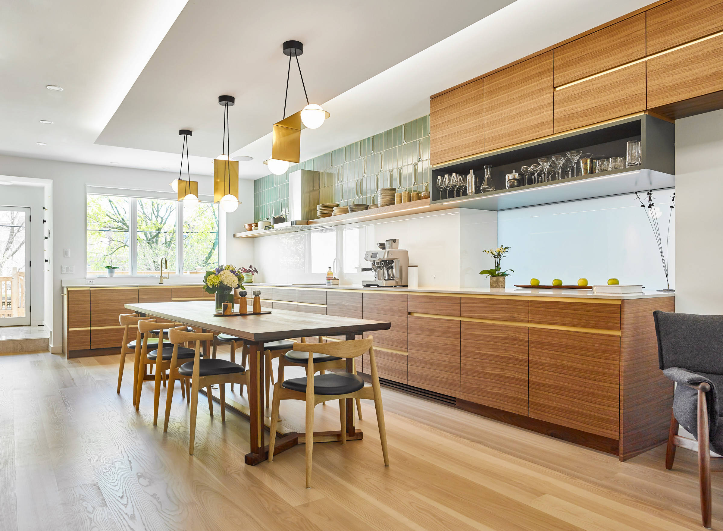 Designer Wanda Ely used flat-panel walnut with integrated brass-lined pulls in the Toronto kitchen seen here. A matte finish keeps the natural grain of the wood visible.