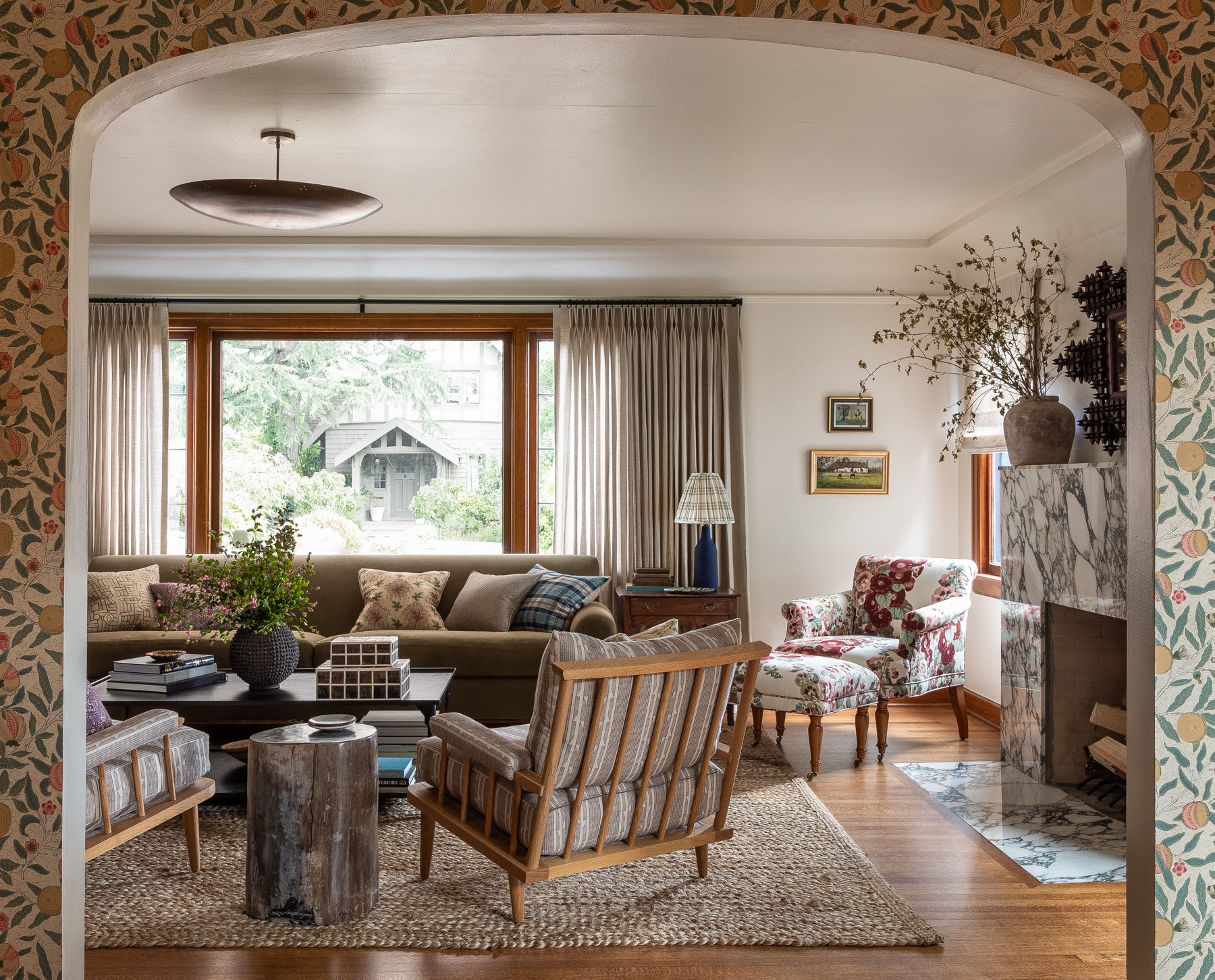 The living room shown here by Heidi Caillier Design is a good example of the collected-over-time approach. A roll-arm sofa in a textured fabric joins an accent chair upholstered in a flower print and two armchairs in patterned fabric for a mix that feels fitting for the vintage Tudor house.
