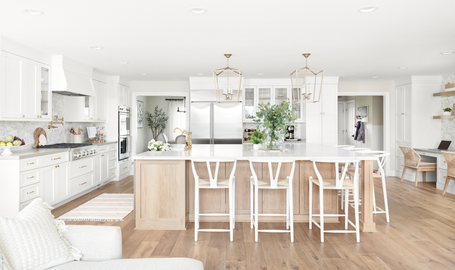 In this Los Gatos, California, kitchen, she created a supersized island with a light-wood base, a marble-look quartz countertop and seating for six.