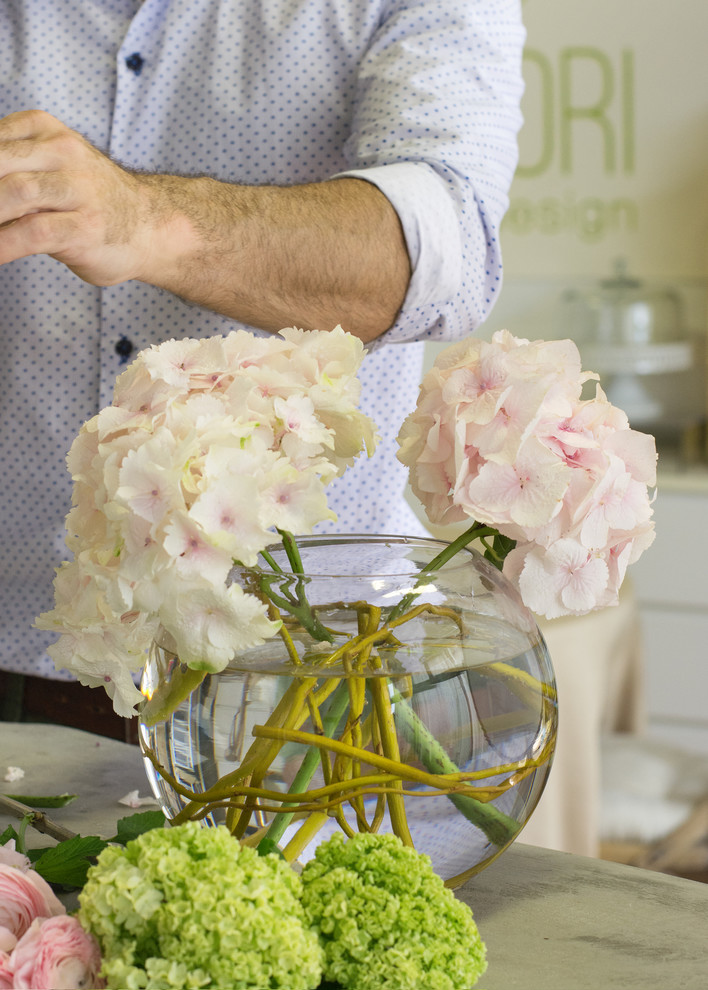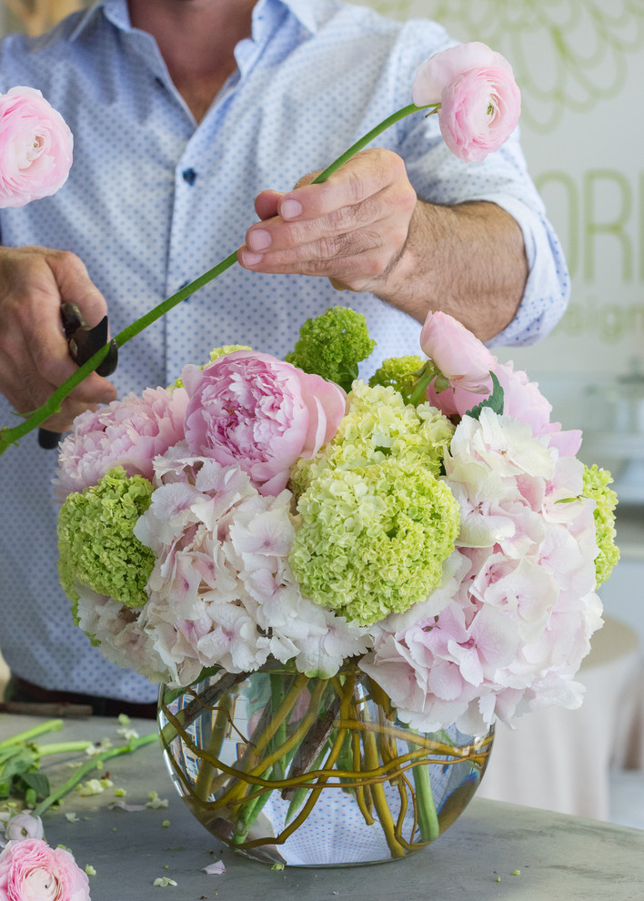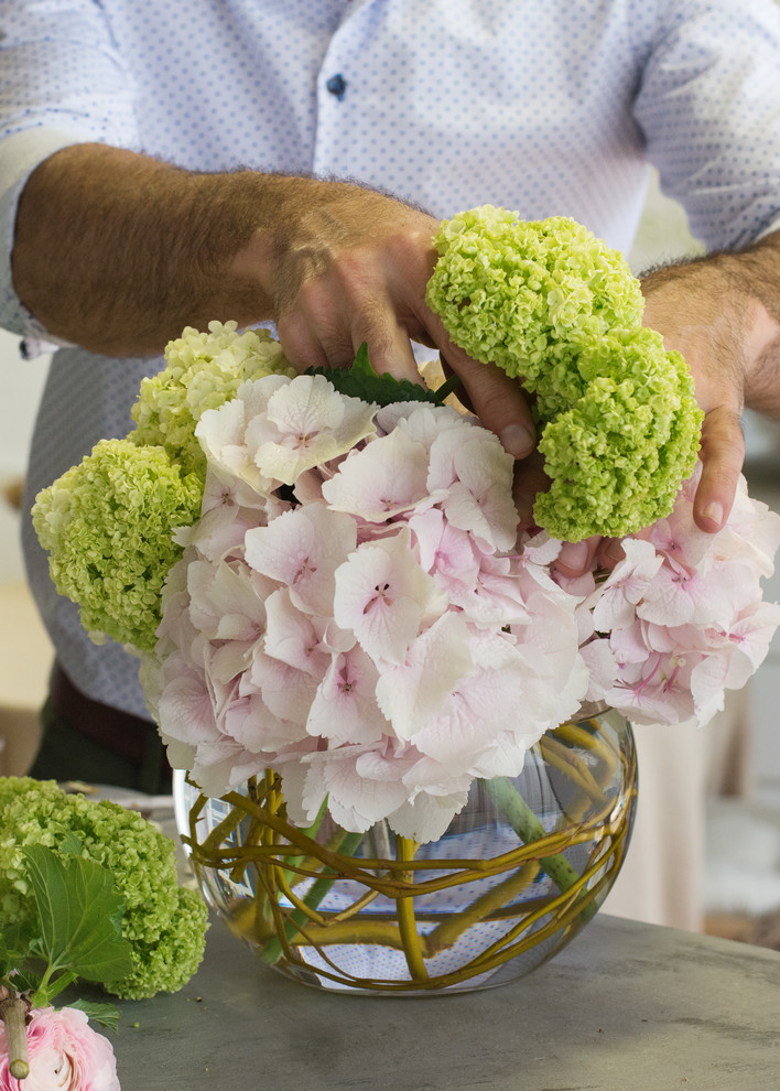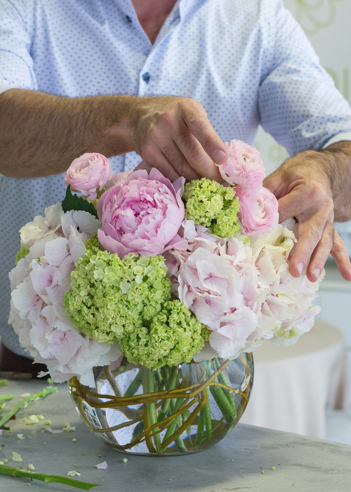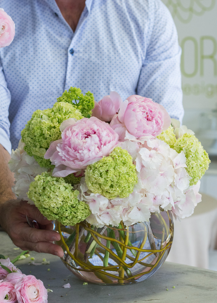 Bouquets of peonies and hydrangeas like this are among Del Pero’s most popular requests. To make one yourself, he recommends buying flowers the day before and picking the freshest open blooms. “Always make a fresh cut on the stems when you come home and put them in water immediately for quick hydration. If open blooms are not available, put closed blooms in warm water for a day to open up,” he says.