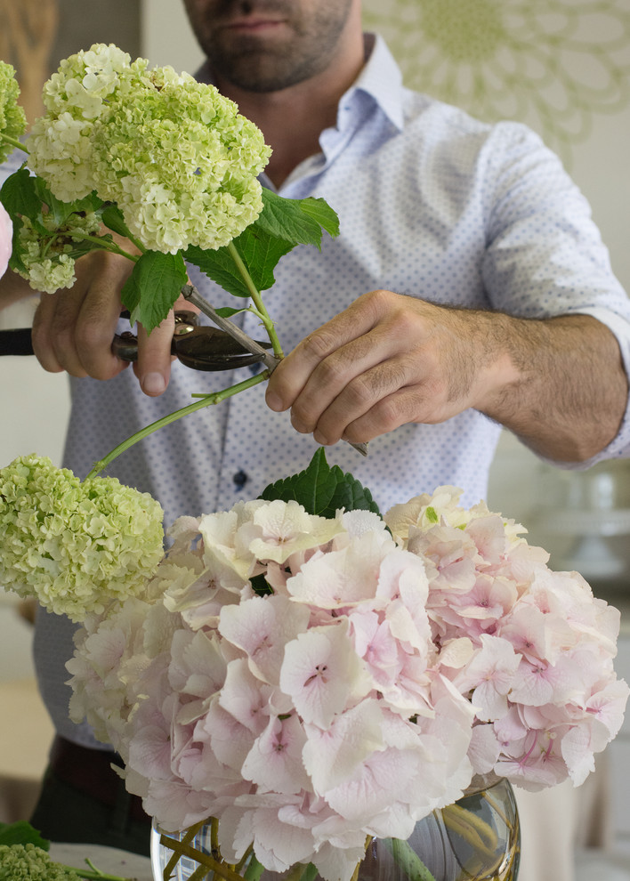 Trim the first hydrangea stem so that the bloom will just cover the top of the vase when resting diagonally inside it.
