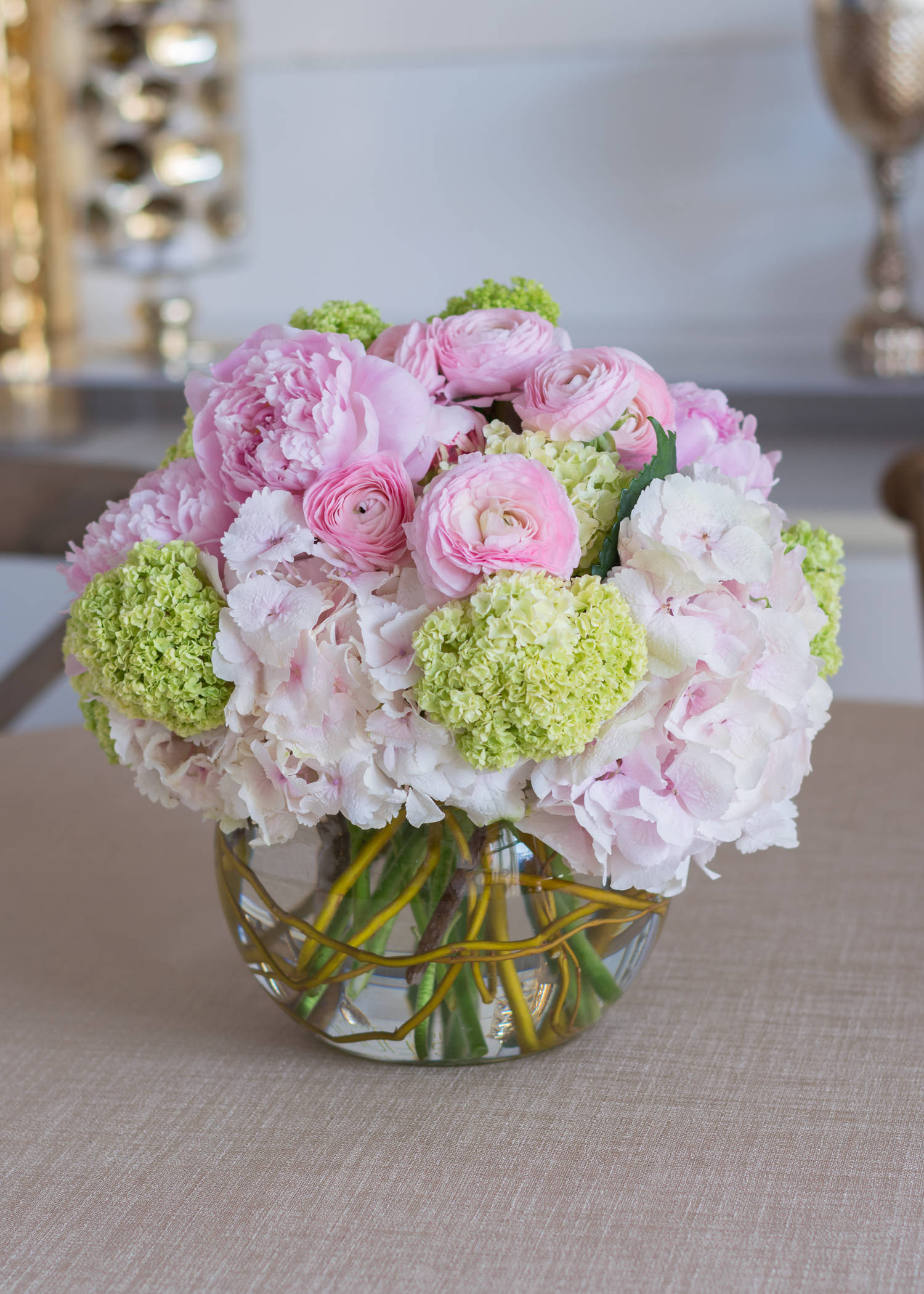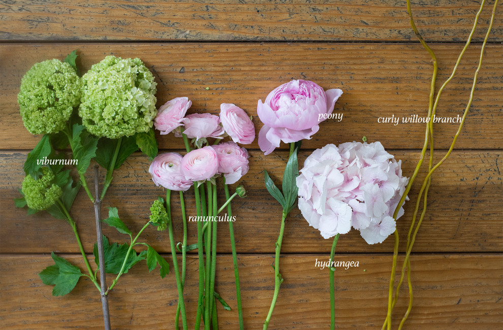 10. Trim the peonies and put them among the viburnum and hydrangea stems in a casual, somewhat random pattern.