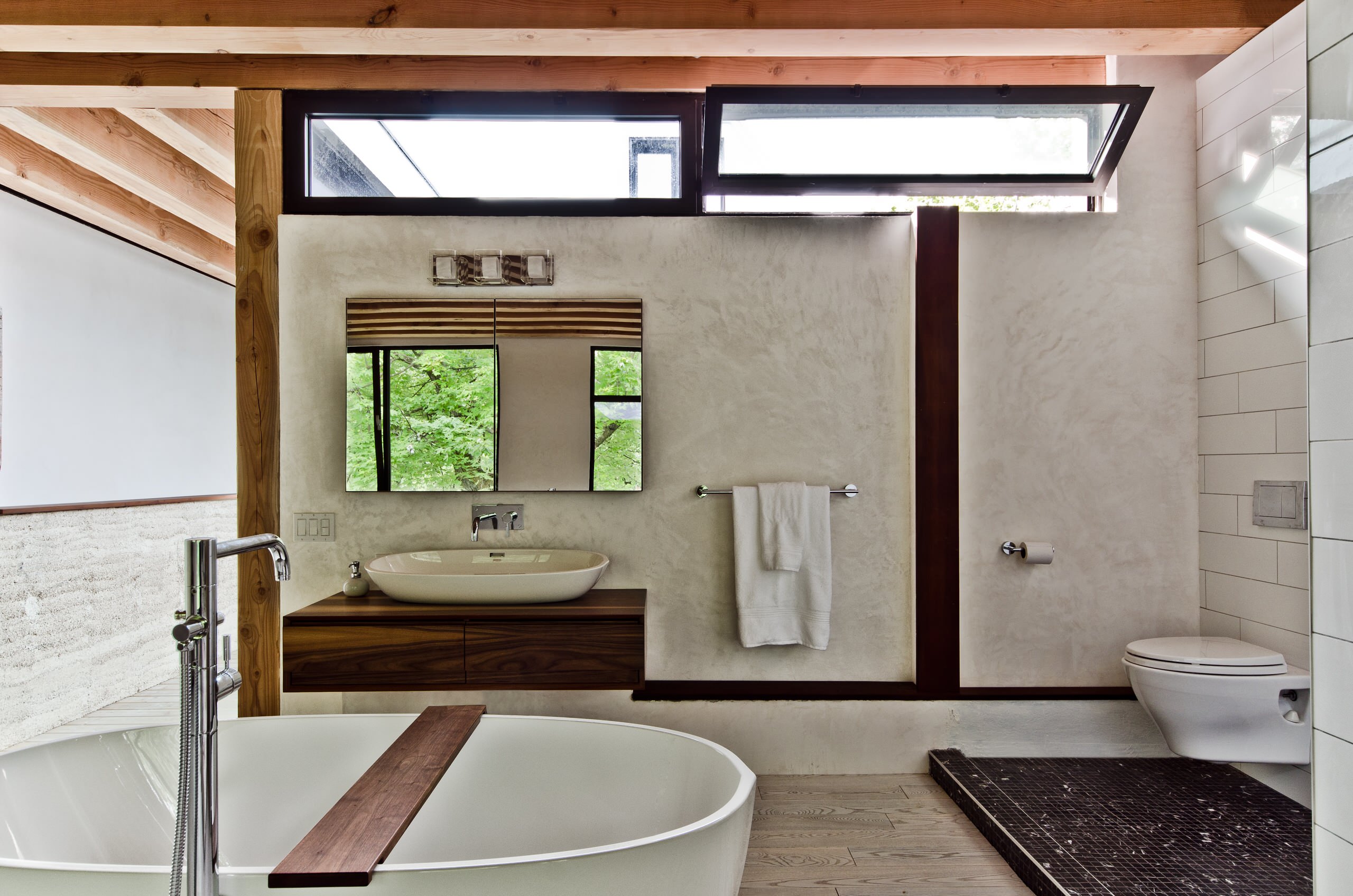 This is a good example of nice movement framing the home. The camera is parallel to the house, but the center point is more to the right. The photo feels balanced by the strong vertical of the center tree.