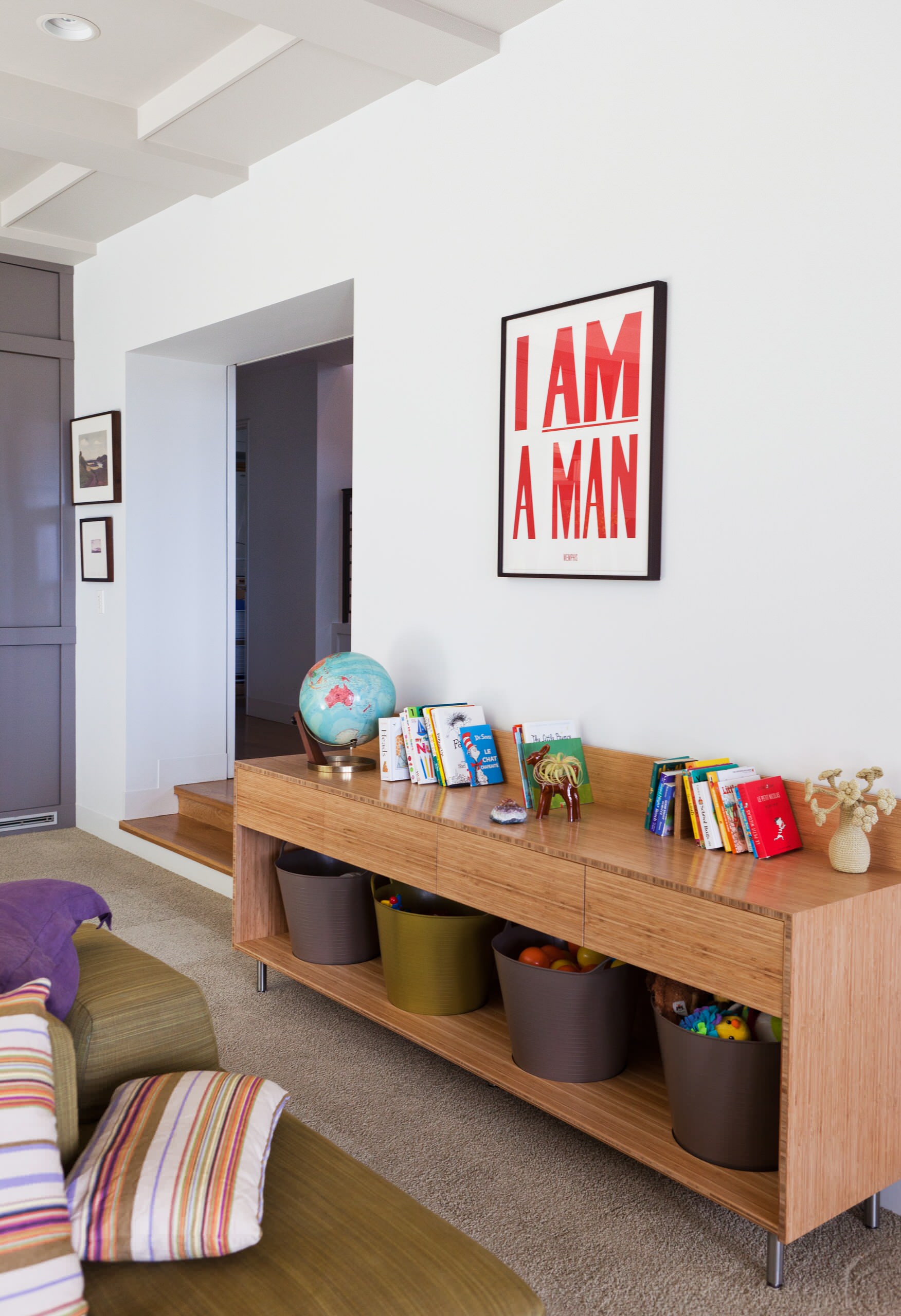 In this room, by Natasha Barrult Design, a simple console became a storage powerhouse with the addition of bins that appeal to all ages.