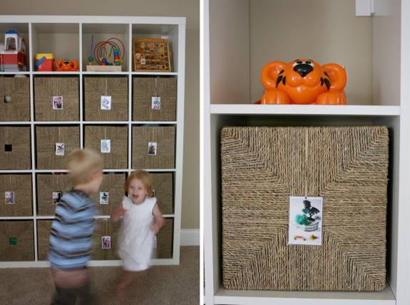 How: She says that container choice can be everything. “For a playroom or a child’s room, I favor bins that are clear or low enough for a child to peek in and see what’s inside,” she says. “If you get plastic bins that are frosted, it blurs everything out a bit for a uniform look, but you can still easily see what’s inside.”