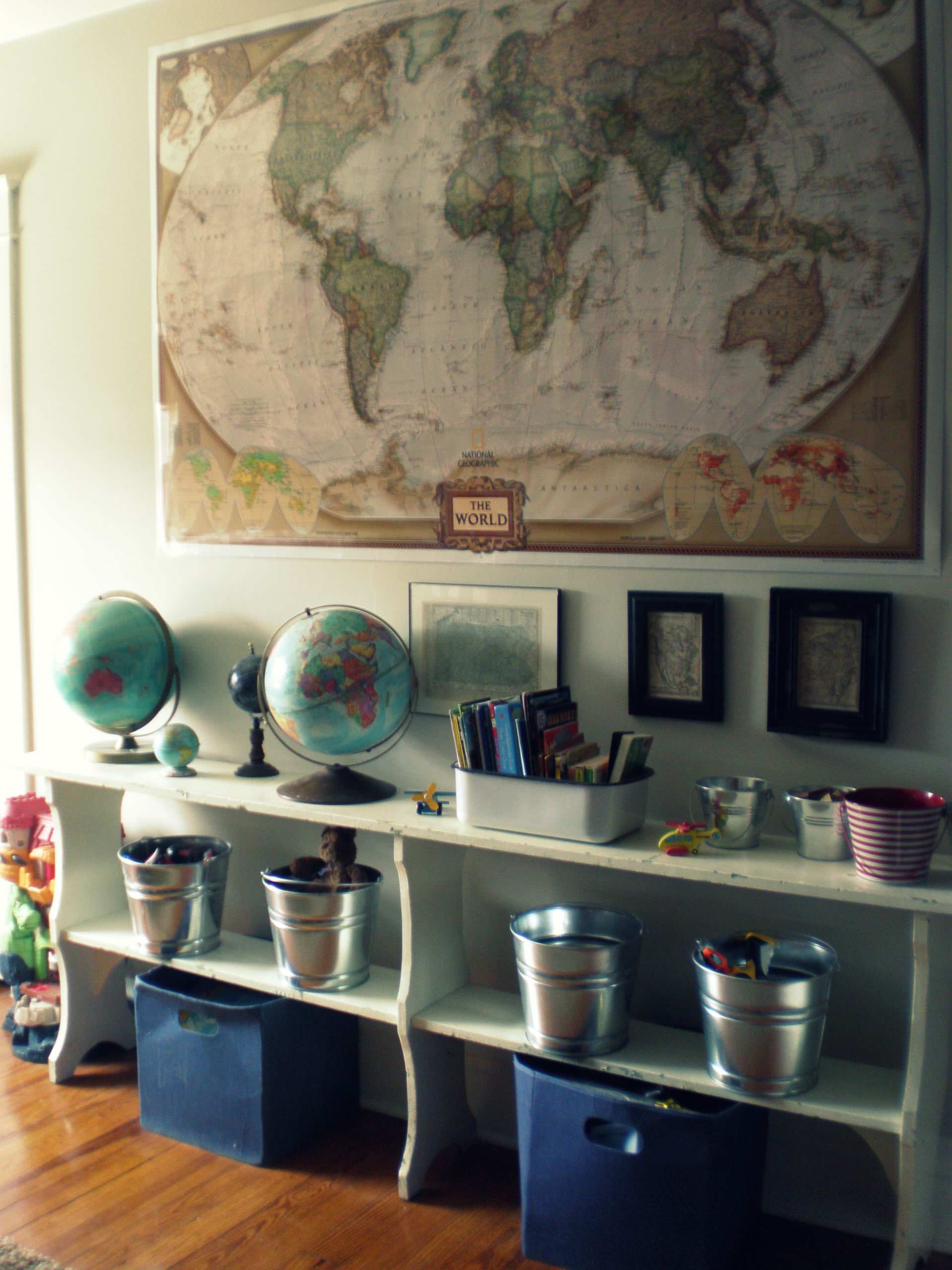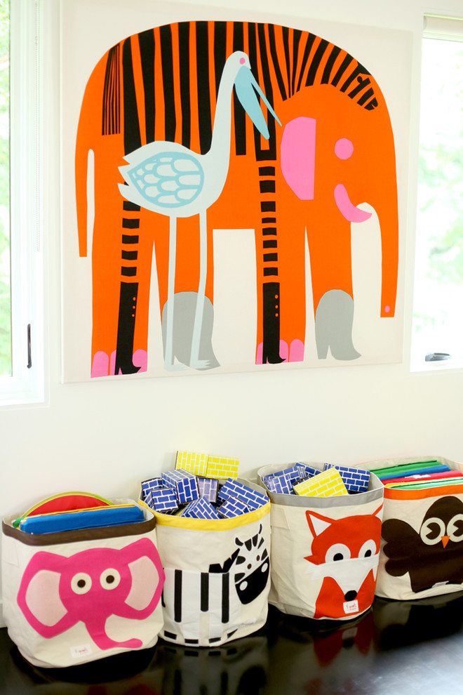 For bulky items, smaller containers won’t always do the trick. Hershman says big canvas hampers can save the day. In this playroom she used them for the largest and unwieldiest toys. “This is why you want to get the smaller stuff up off the floor,” she says. “It makes way for the bigger stuff you can’t store any other way.”