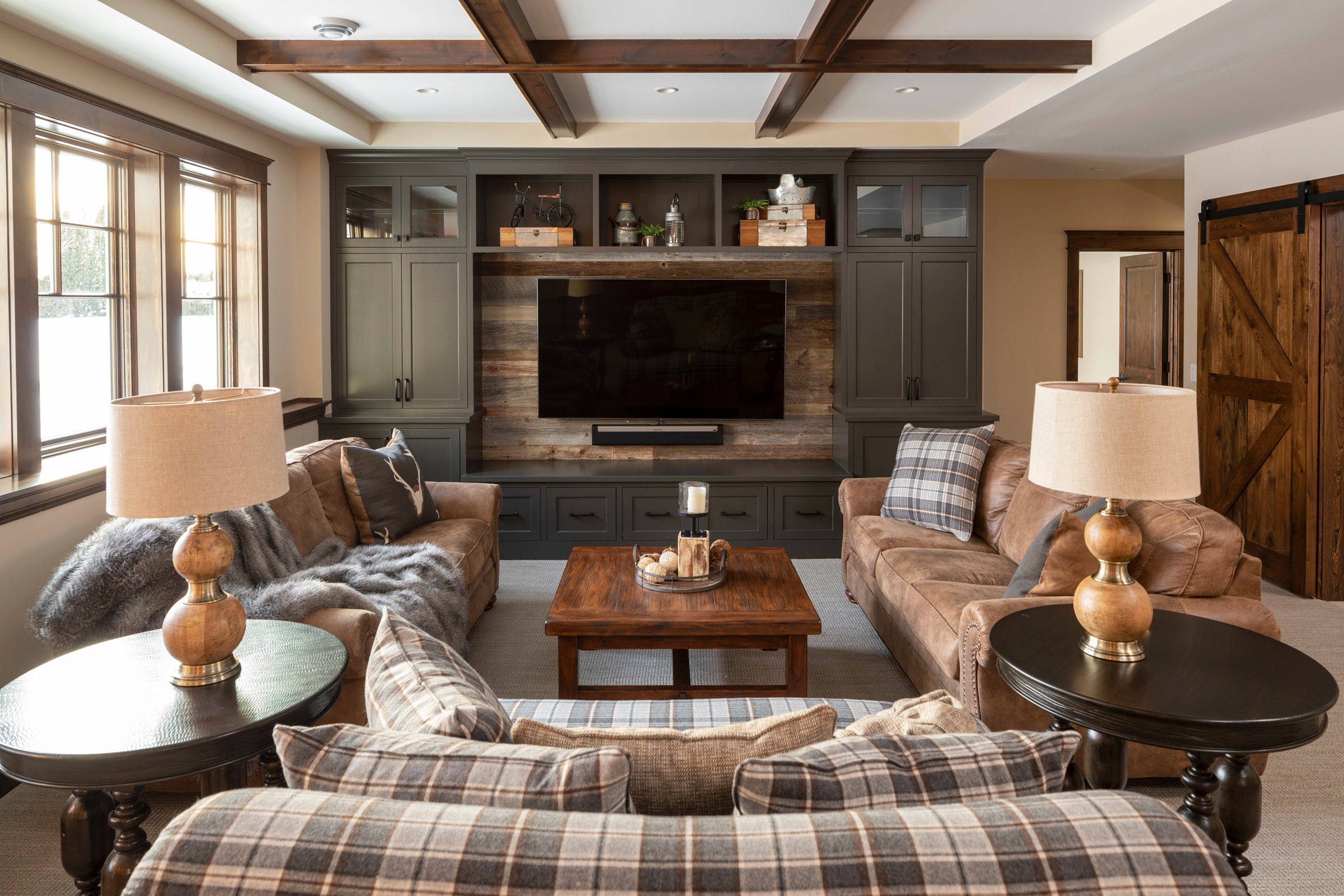 Cushy leather sofas, plaid pillows, wood barn doors and a reclaimed wood accent wall give cozy cabin style to this Minneapolis basement by Mark D. Williams Custom Homes. Box beams on the ceiling make sense of the challenges posed by soffits and ductwork (a common issue in basement spaces). And well-planned built-ins keep media equipment, games and books organized.