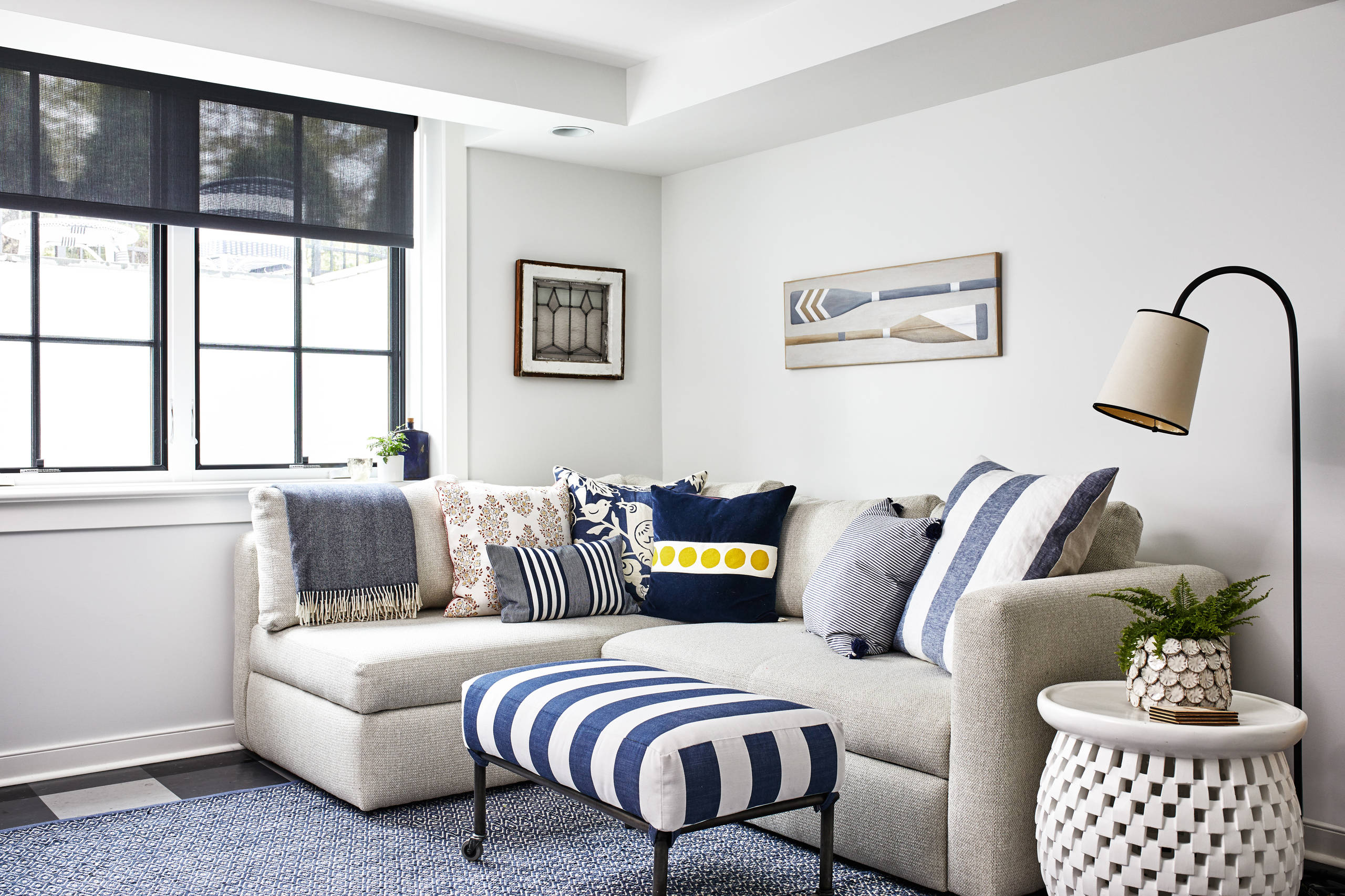 A deep window well allowed for full-size windows in this basement in Alexandria, Virginia. Architect Laura Campbell played off the increase in natural light, infusing the room with a light, beachy style. Using tans and creams, rather than white, tones down coastal crispness for something warmer.