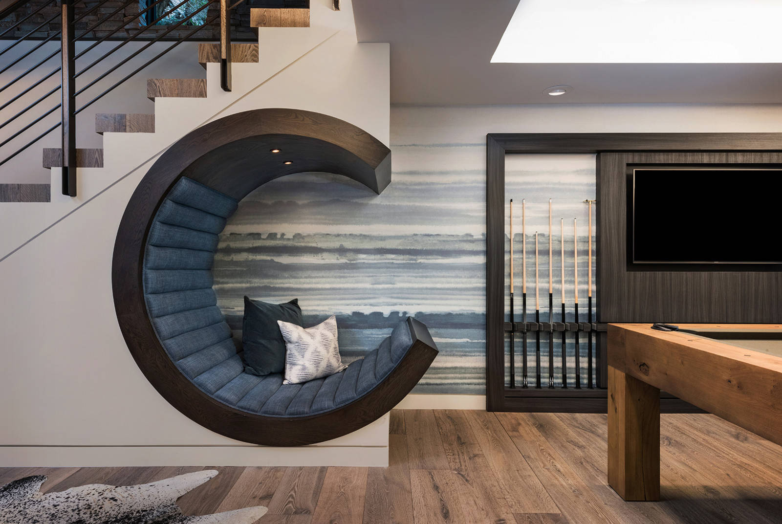 In this San Diego basement, the architects at Oasis Architecture & Design took advantage of the space beneath the stairs, transforming it into a C-shaped reading nook. The abstract mural’s horizontal lines emphasize length rather than height. And the pool cue rack integrated into the TV wall had many Houzzers taking notes as they saved this photo to their ideabooks.