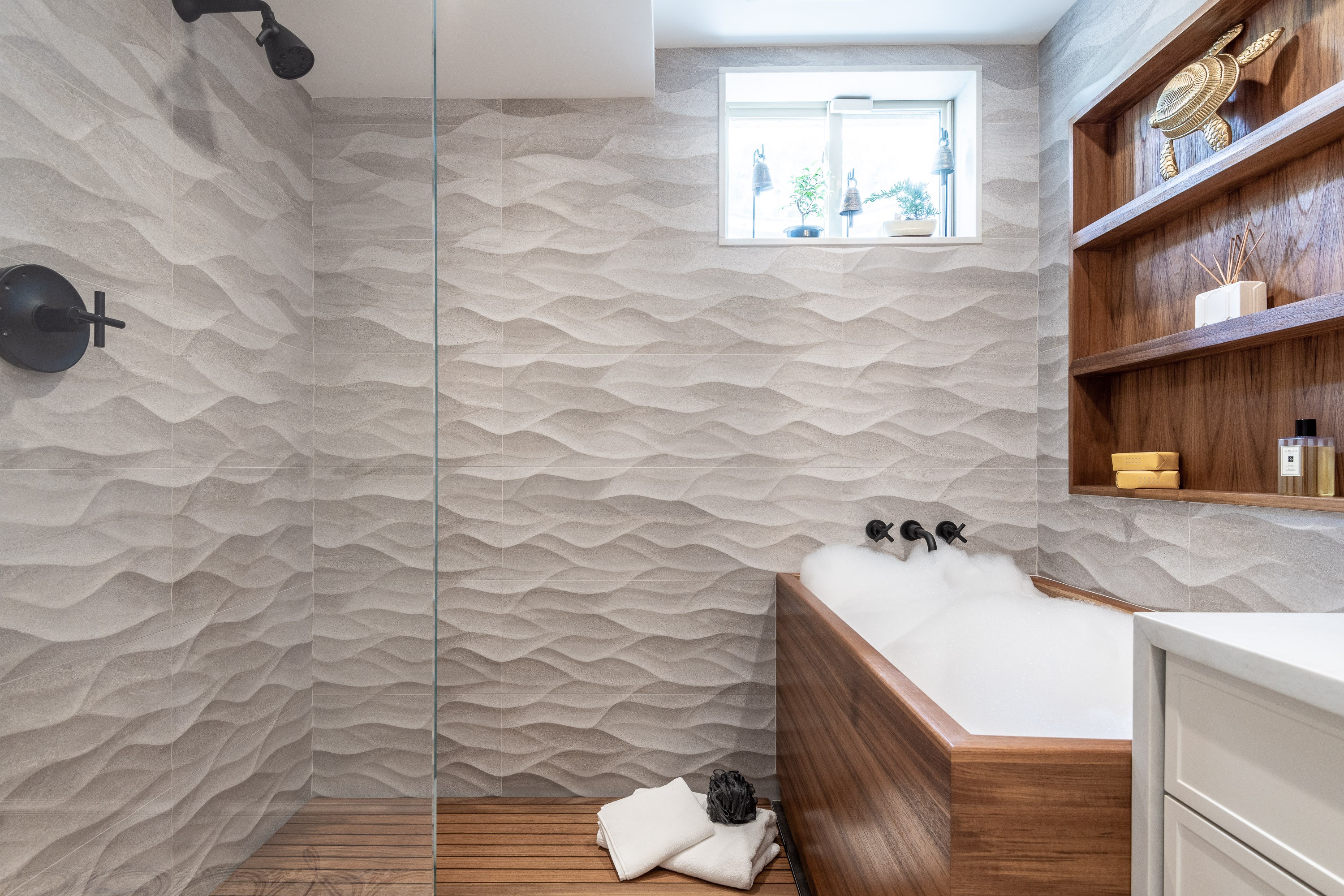 This Chevy Chase, Maryland, basement has a workout space, so when planning a renovation for the adjacent bathroom, designer Jennifer Gilmer suggested a teak Japanese bathtub for post-workout soaks. The family wholeheartedly agreed, and the style of the tub inspired the rest of the basement bathroom’s design. This includes the teak shower floor and shelving as well as wavy 3D wall tiles. The result is a Japanese Zen-inspired respite.
