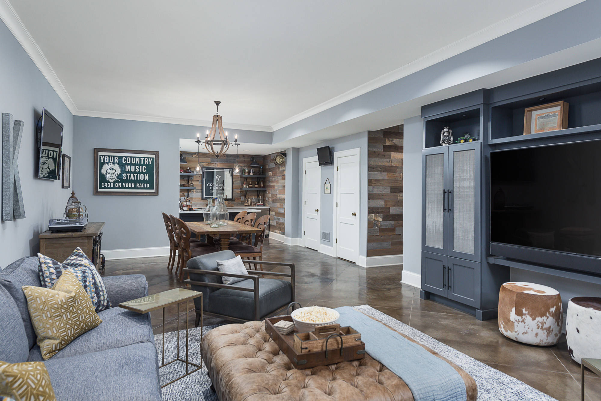 Cool gray-blues paired with wood textures give this Chicago basement a refined rustic-meets-industrial look. Reclaimed wood walls and furnishings of leather and hide bring in rustic elements while metallic finishes add shine. Beautiful upholstery elevates the entire space.