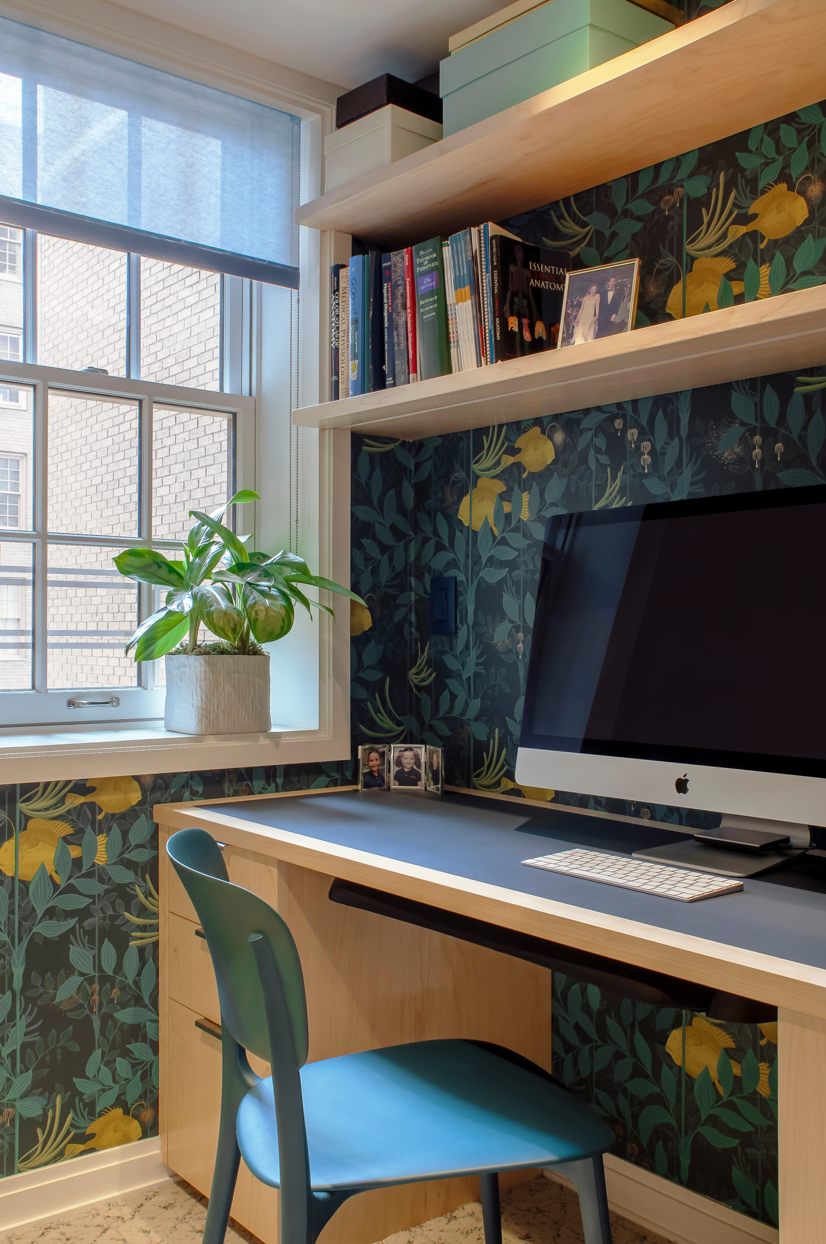 Architect Lauren Rubin gave this New York City home office a tropical vibe with a wallpaper that depicts fish and underwater plants. A custom maple desk features an inset blue linoleum top.