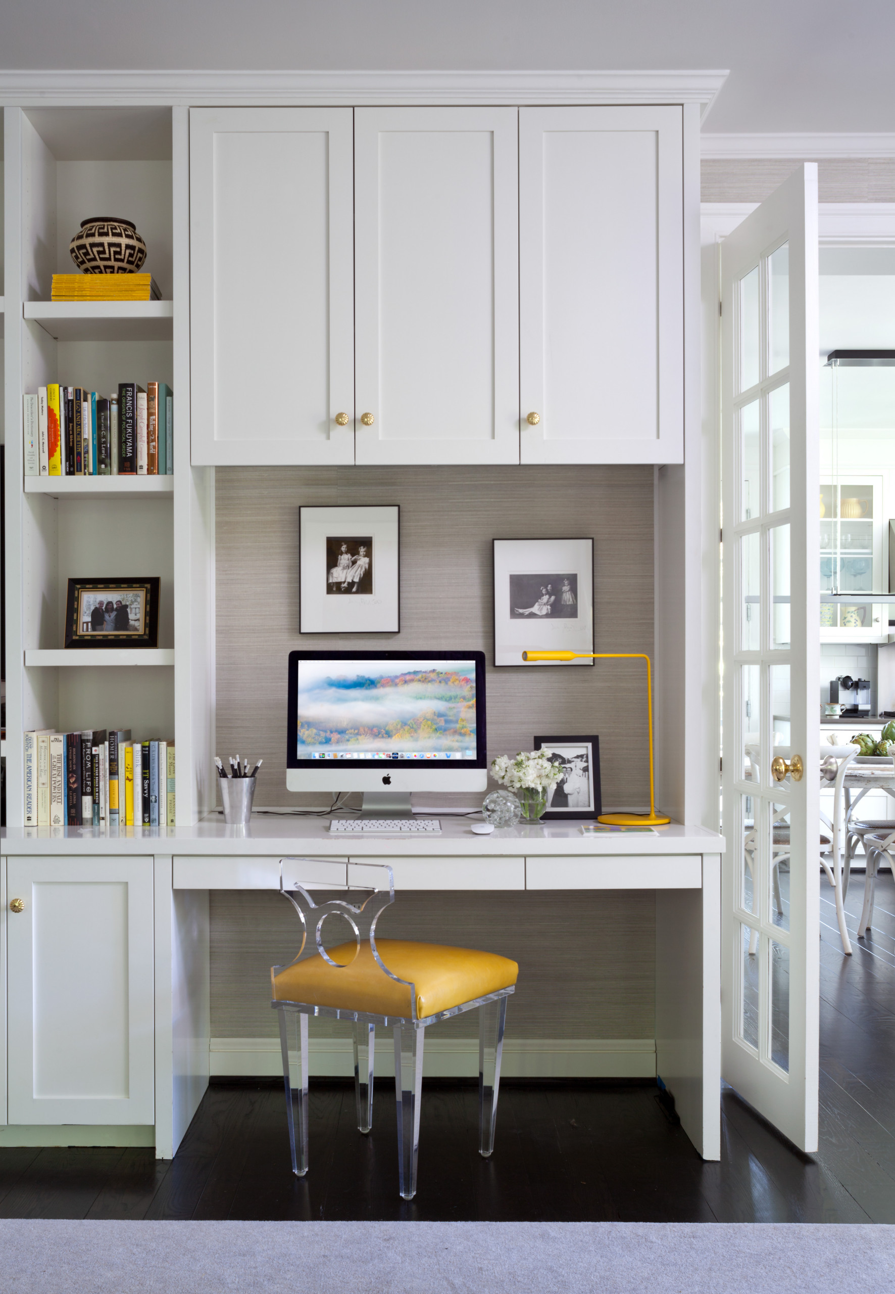 Custom white built-ins with brass pulls and a wall covered in grasscloth make a stylish backdrop for the space. The Lucite desk chair blends in, while the yellow upholstered seat coordinates with a yellow desk lamp and other accessories.