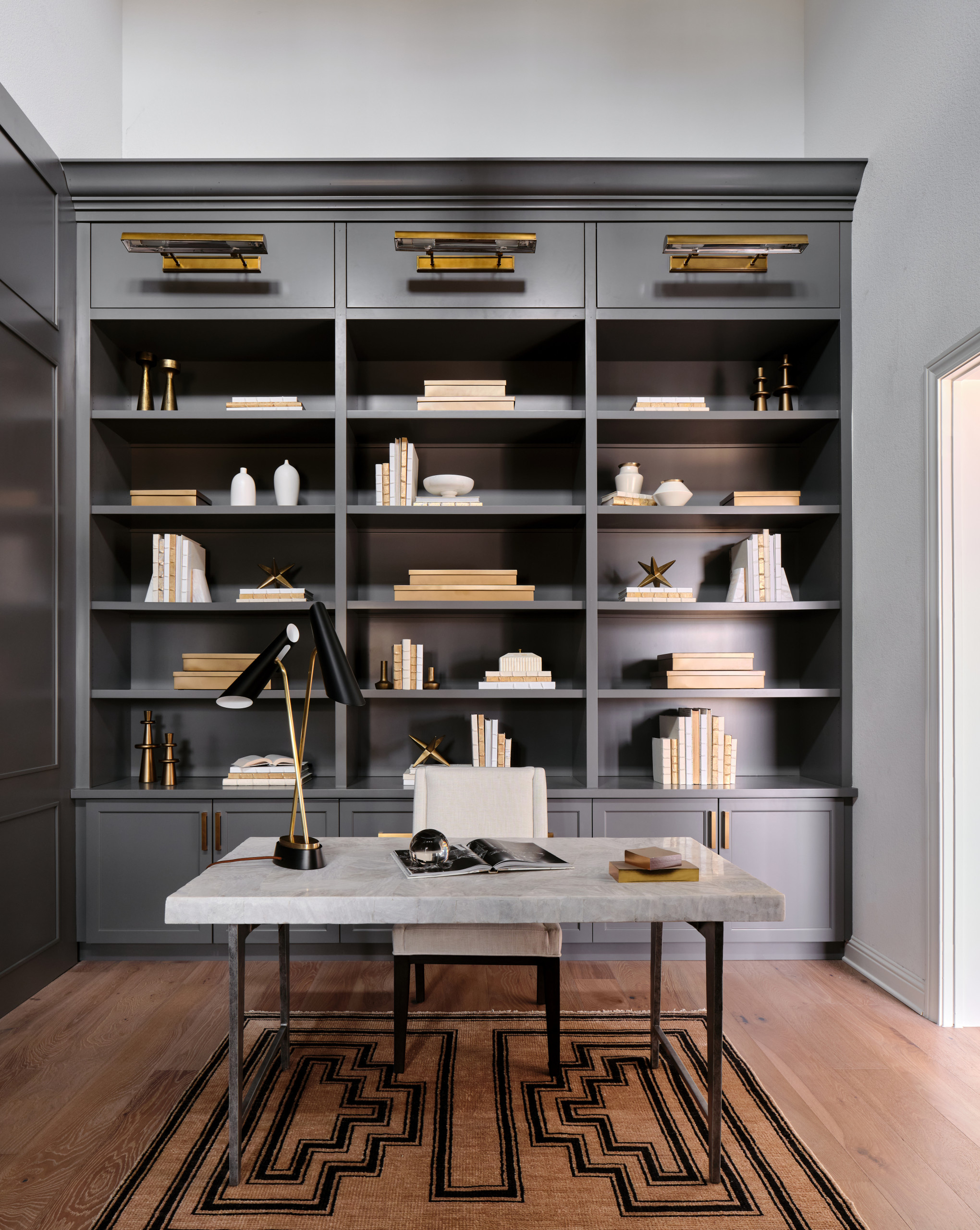 Haven Design and Construction designed 12-foot-tall built-in bookcases to add architectural detail to the white 22-foot-tall walls in this Austin, Texas, home office.
