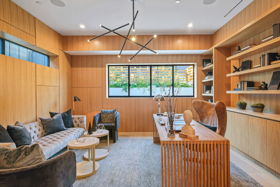 Panels of striated wood cover the walls of this contemporary home office in Los Angeles. The wall behind the desk has built-in shelves and cabinets that offer display space and plenty of storage. Meridith Baer Home staged this workspace.