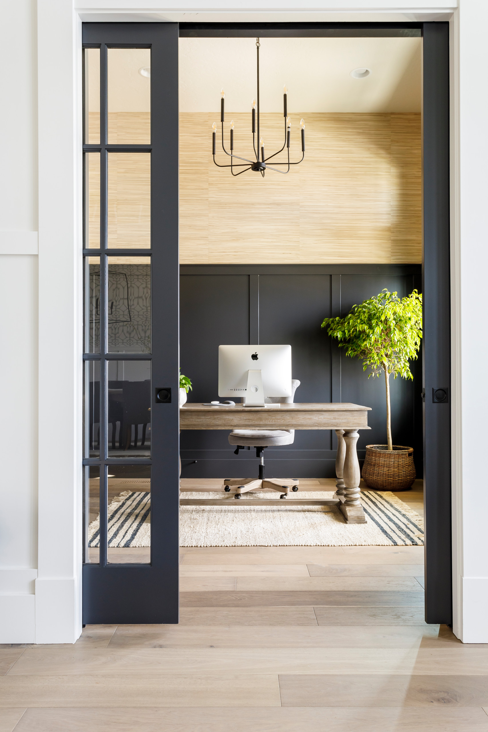 Paneled glass pocket doors allow the owner of this chic home office in Boise, Idaho, to create a quiet, closed-off space or an open and airy one as needed. Judith Balis Interiors elevated the style of the space with black wainscoting, grasscloth wallpaper and a cerused oak desk.