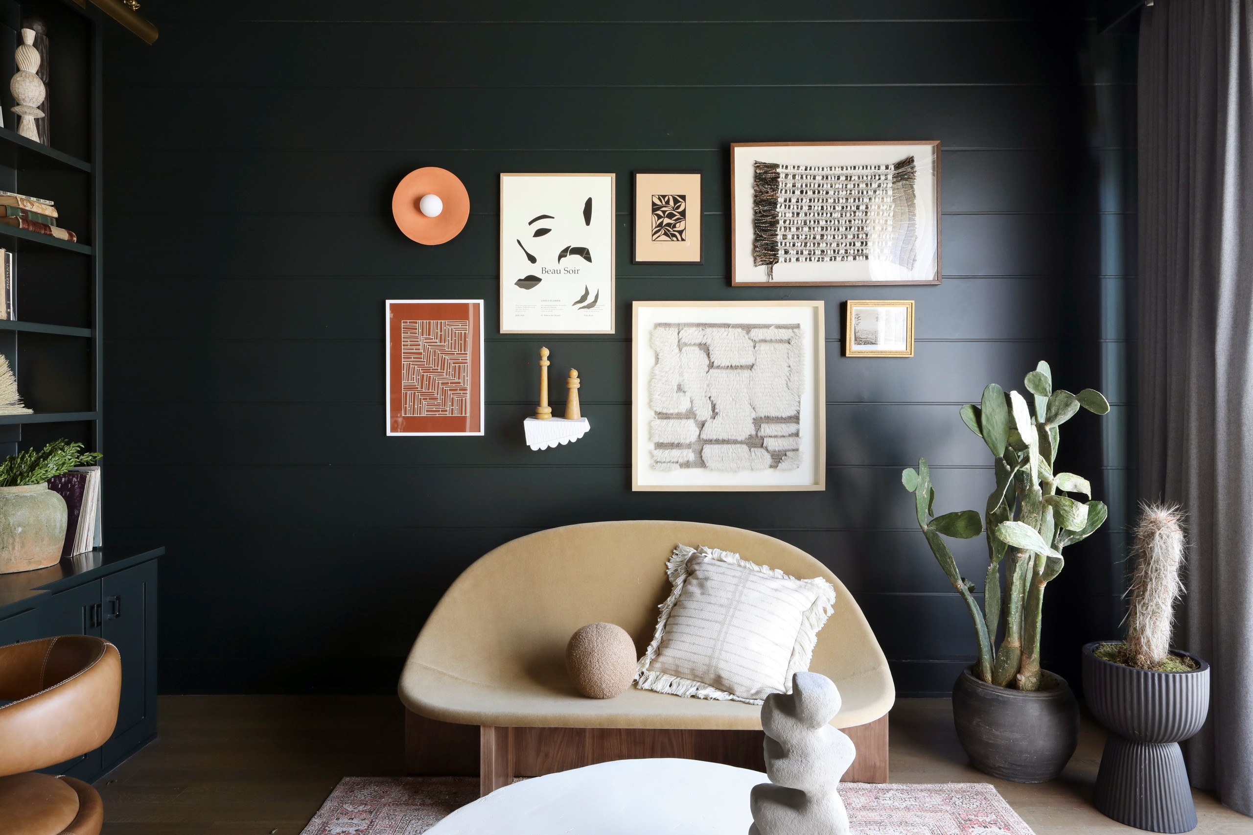 Black shiplap walls and an all-black custom built-in desk and shelves set the tone for a bold and moody Dallas home office by Urbanology Designs. The seating area, with its sculptural settee sofa, wall art and potted plants, provides a stylish spot to take a work break.