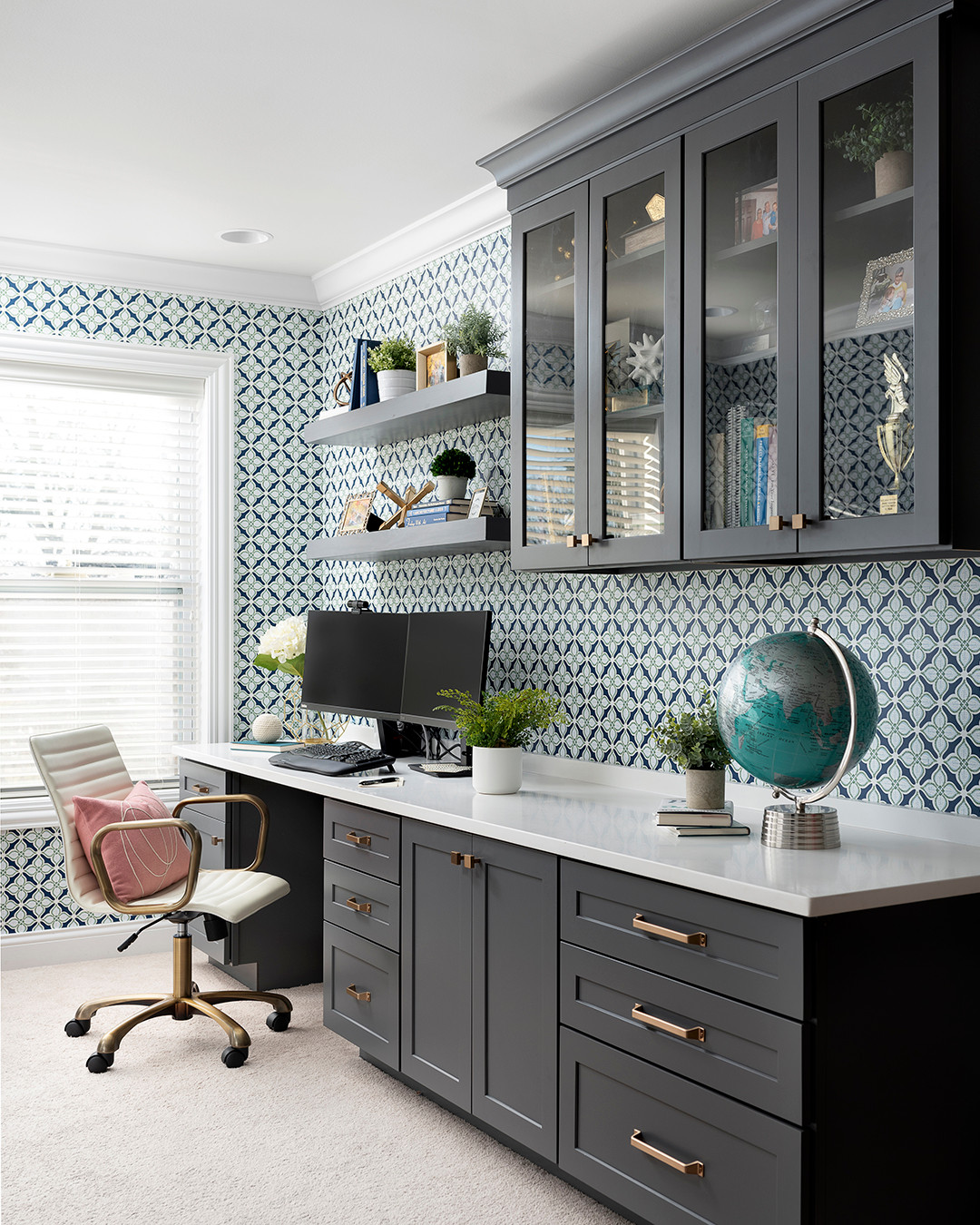 Bold geometric patterned wallpaper adds color and pizazz to this Chicago home office by Chad Esslinger Design. Dark-painted built-in cabinets, floating shelves and a desk with a white quartz countertop complete the scene.