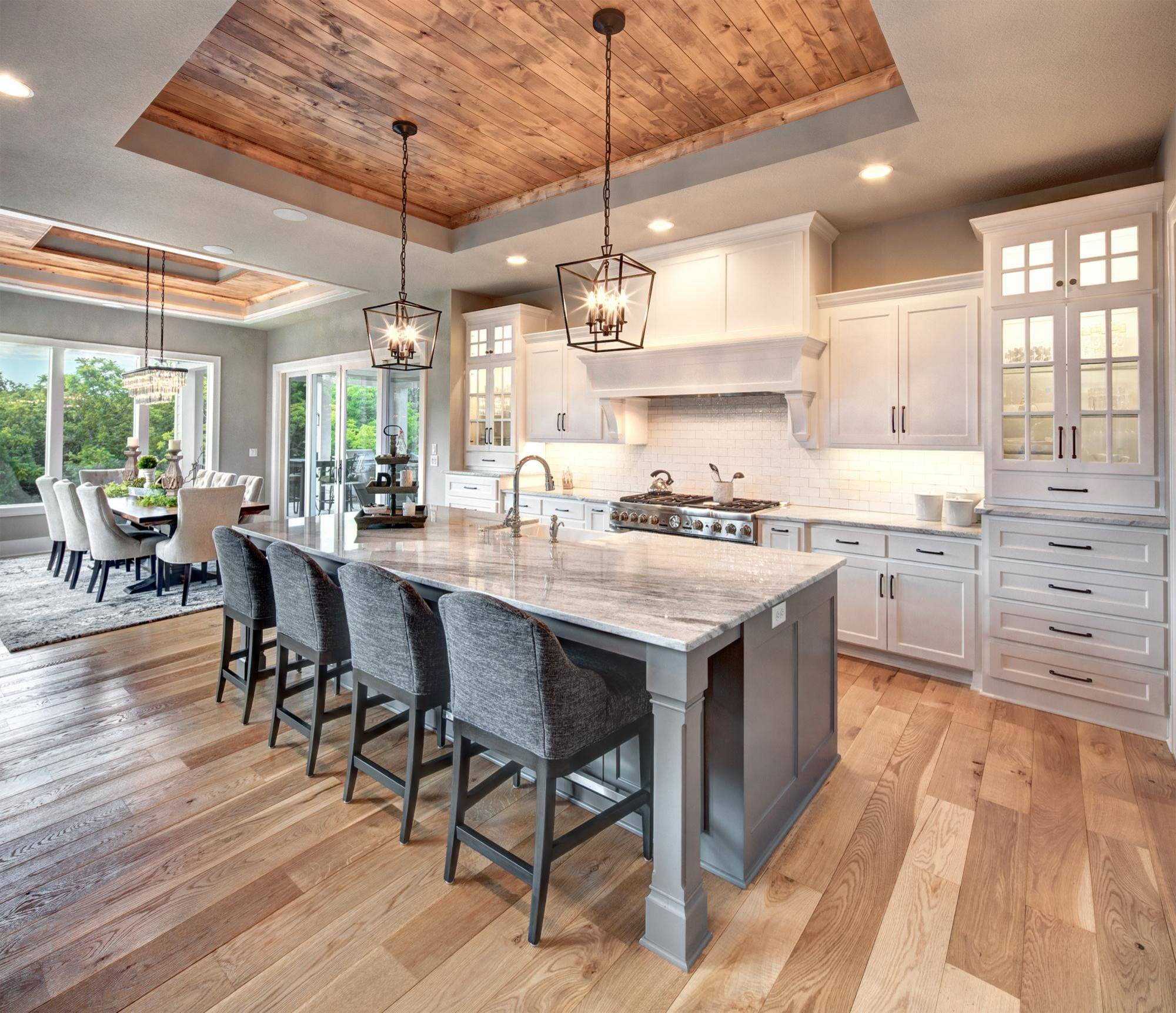This kitchen in Kansas City, Kansas, by KC Drafting & Design commands attention with its eye-catching wood-paneled tray ceiling. The counters, cabinets and backsplash are done in soft, muted colors that recede and allow the ceiling to stand out, while the wood floor echoes the ceiling’s warm hues.