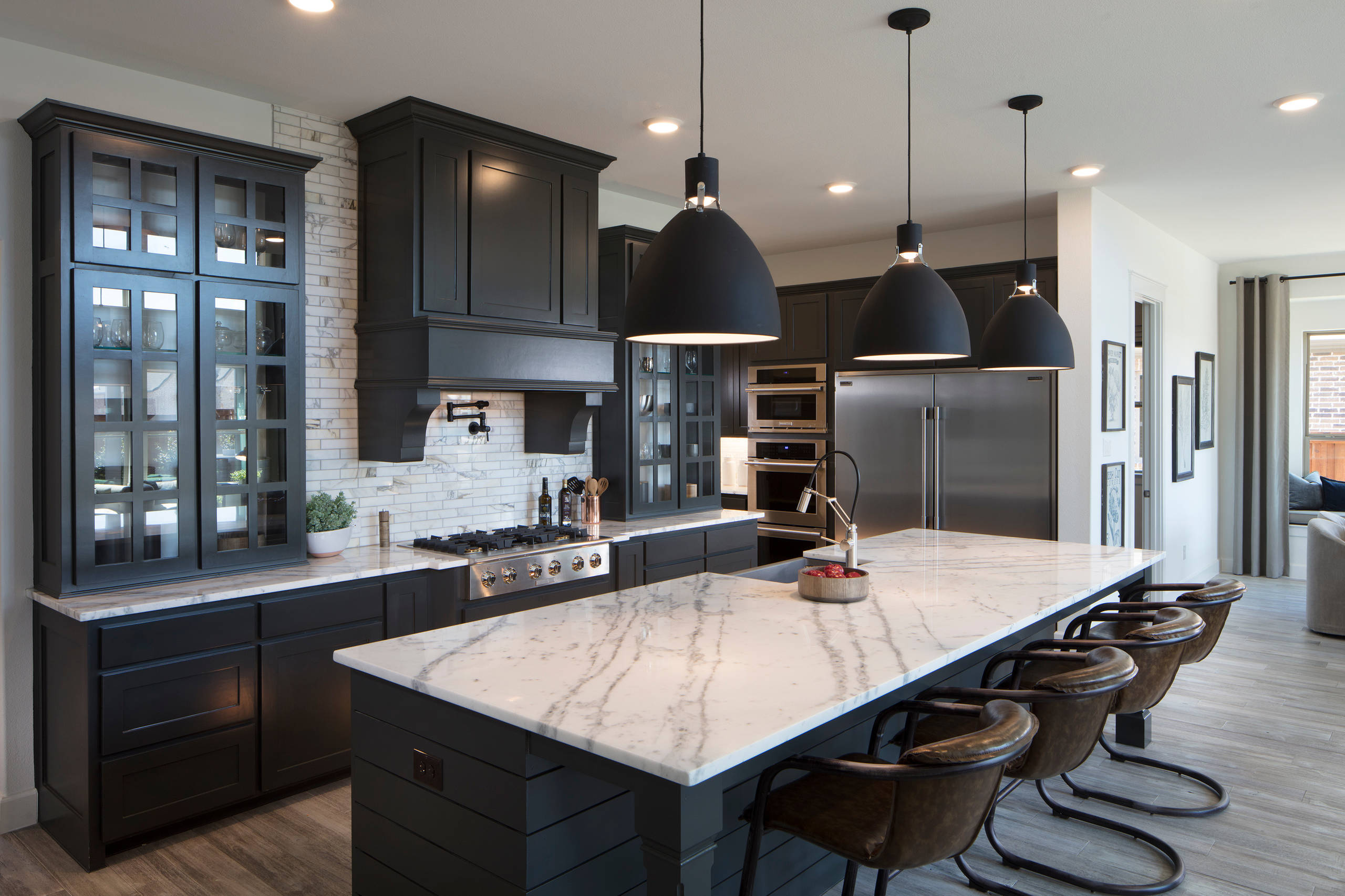 To make this model-home kitchen stand out in a housing community in Frisco, Texas, Christina Wilcocks with design assistant Elena Liz, both of Normandy Homes, started by giving the cabinets a dash of drama with nearly black paint (Iron Ore by Sherwin-Williams). They used the same color on interior doors and other accents around the house.