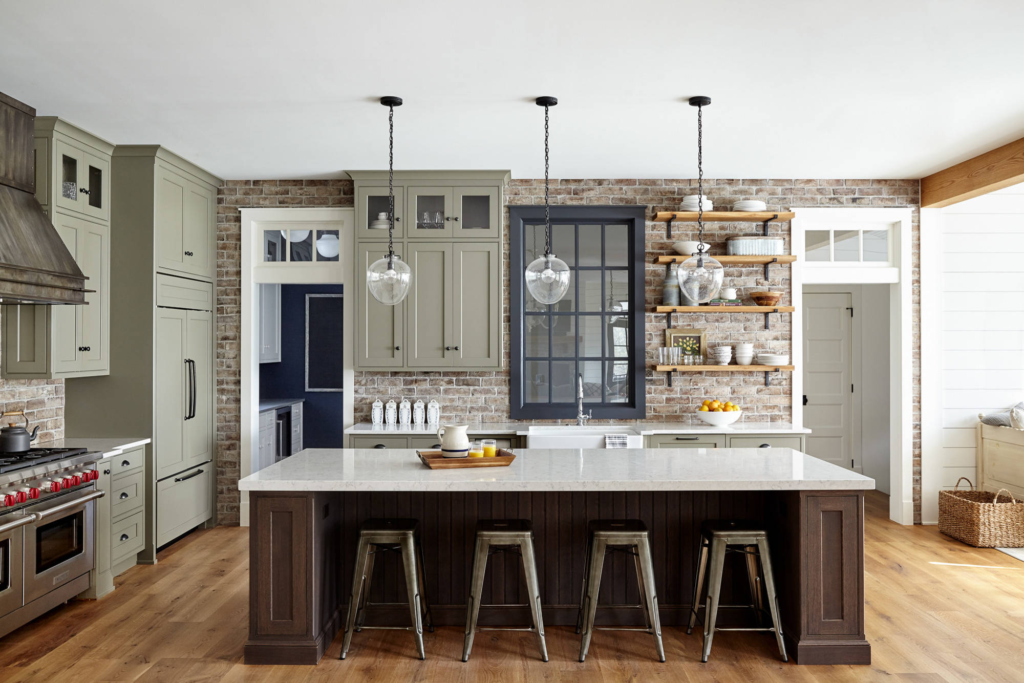 Designer Lisa Furey used Savannah Grey brick, sage-green cabinets and quartersawn oak flooring to give this new-build home in Allentown, Pennsylvania, a heritage feel.