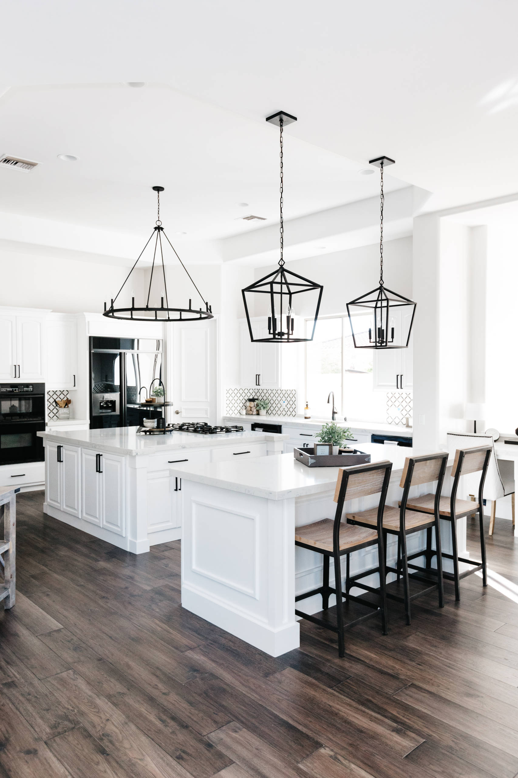 Black hardware, light fixtures and appliances stand out against crisp white cabinets and quartz counters in this kitchen by The TomKat Studio in Chandler, Arizona. Designer Kimberley Stoegbauer used black-and-white marble tile for the backsplash, tying the design’s two dominant colors together with one pattern.