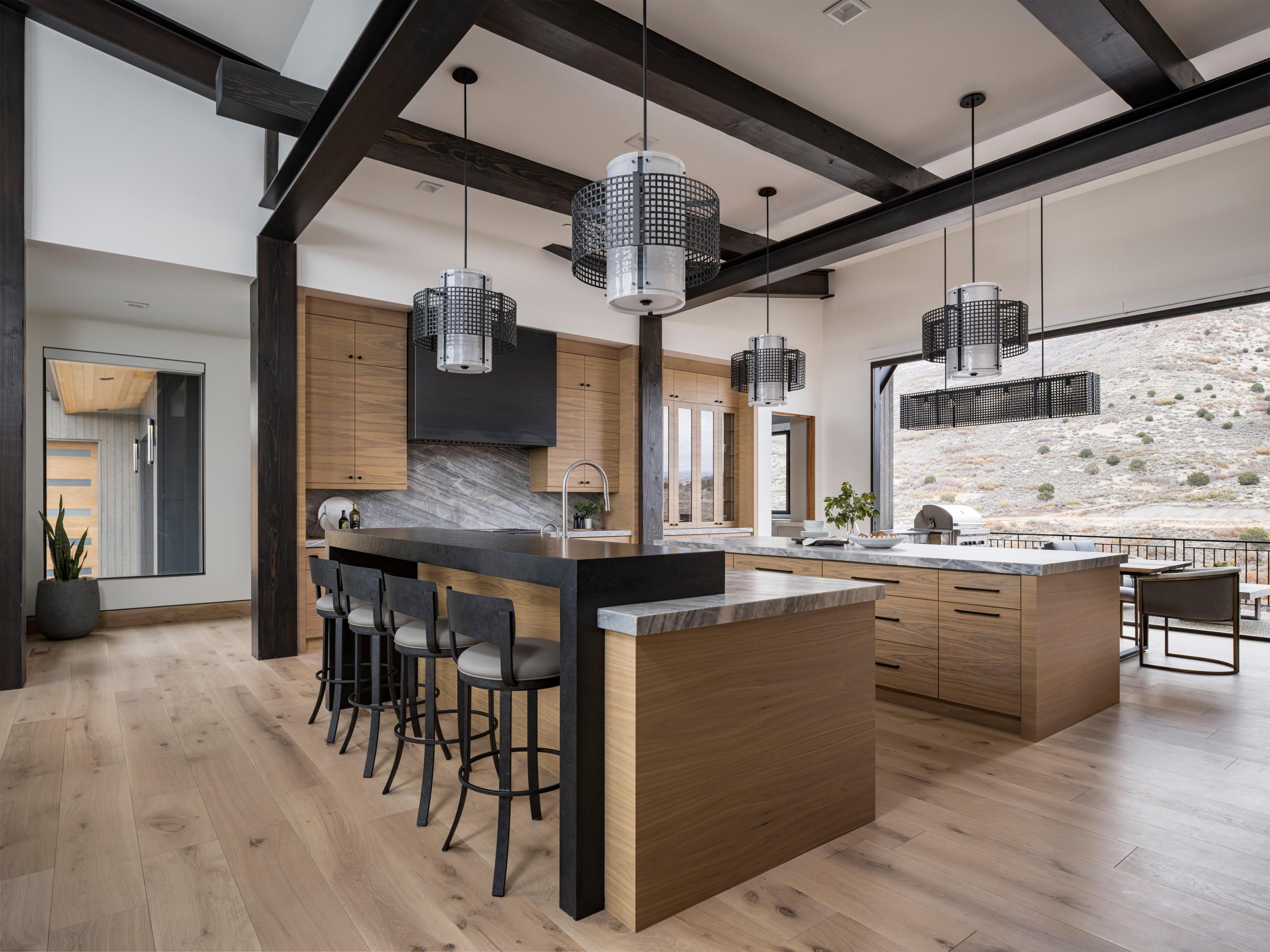 Built by PureHaven Homes in the shadow of Utah’s Wasatch Mountains, this contemporary kitchen is made up of earthy colors and materials that mirror those in the surrounding landscape. The view is spectacular for those seated at the narrow bar, which is spliced into one of the kitchen’s two islands.