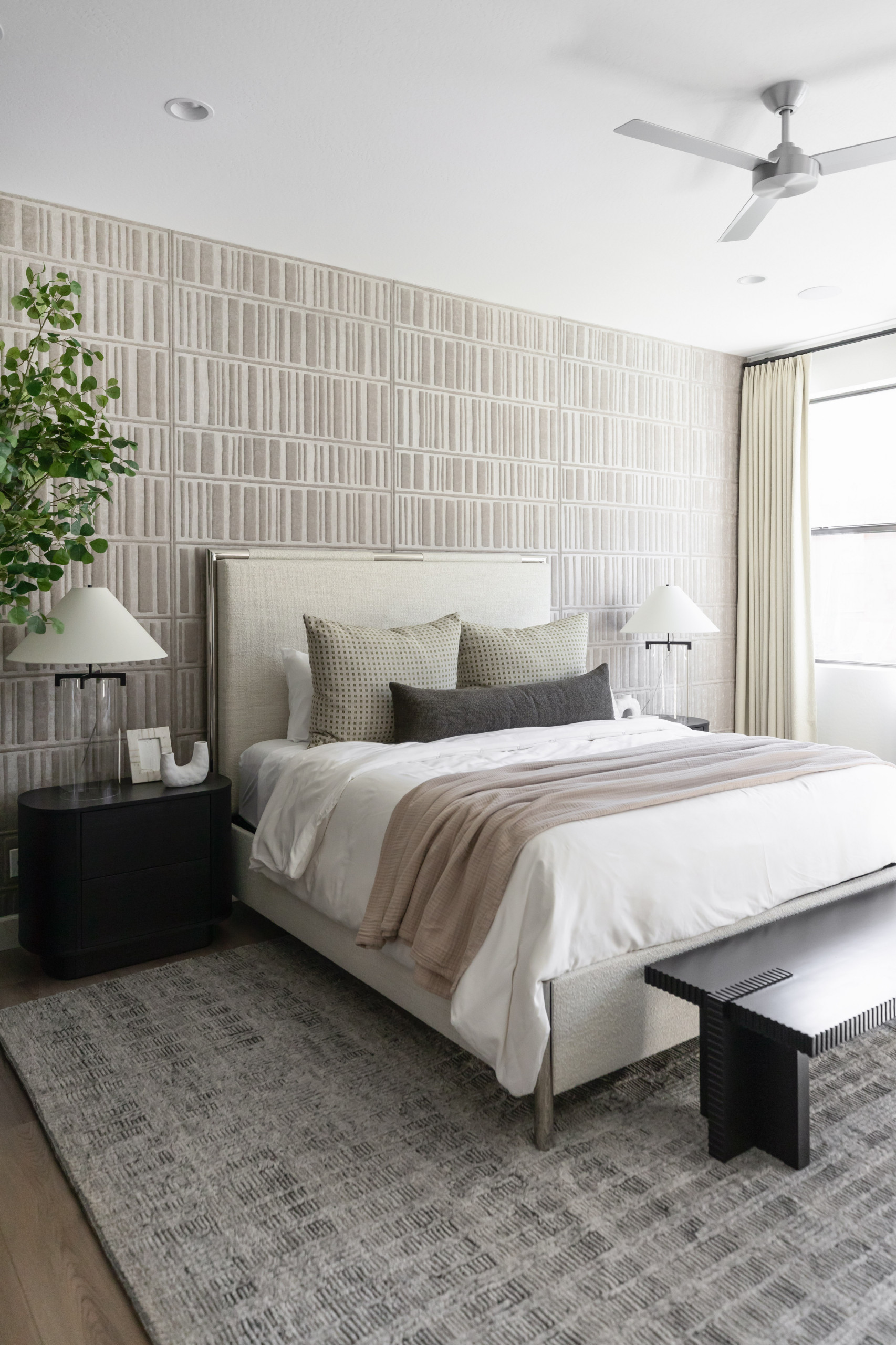 Similar to a tranquil lake reflecting the sky, the area rug in this Scottsdale, Arizona, bedroom has subtle lines that mirror linear strokes in the textural wallcovering. The wallcovering itself has a stone feel, joining the green plant in conjuring an earthy, organic feel, while dark wood nightstands and a bench help ground the lighter elements. Notice too how design firm Living With Lolo used transparent bases on the nightstand lamps to let the wallcovering’s beauty shine through.