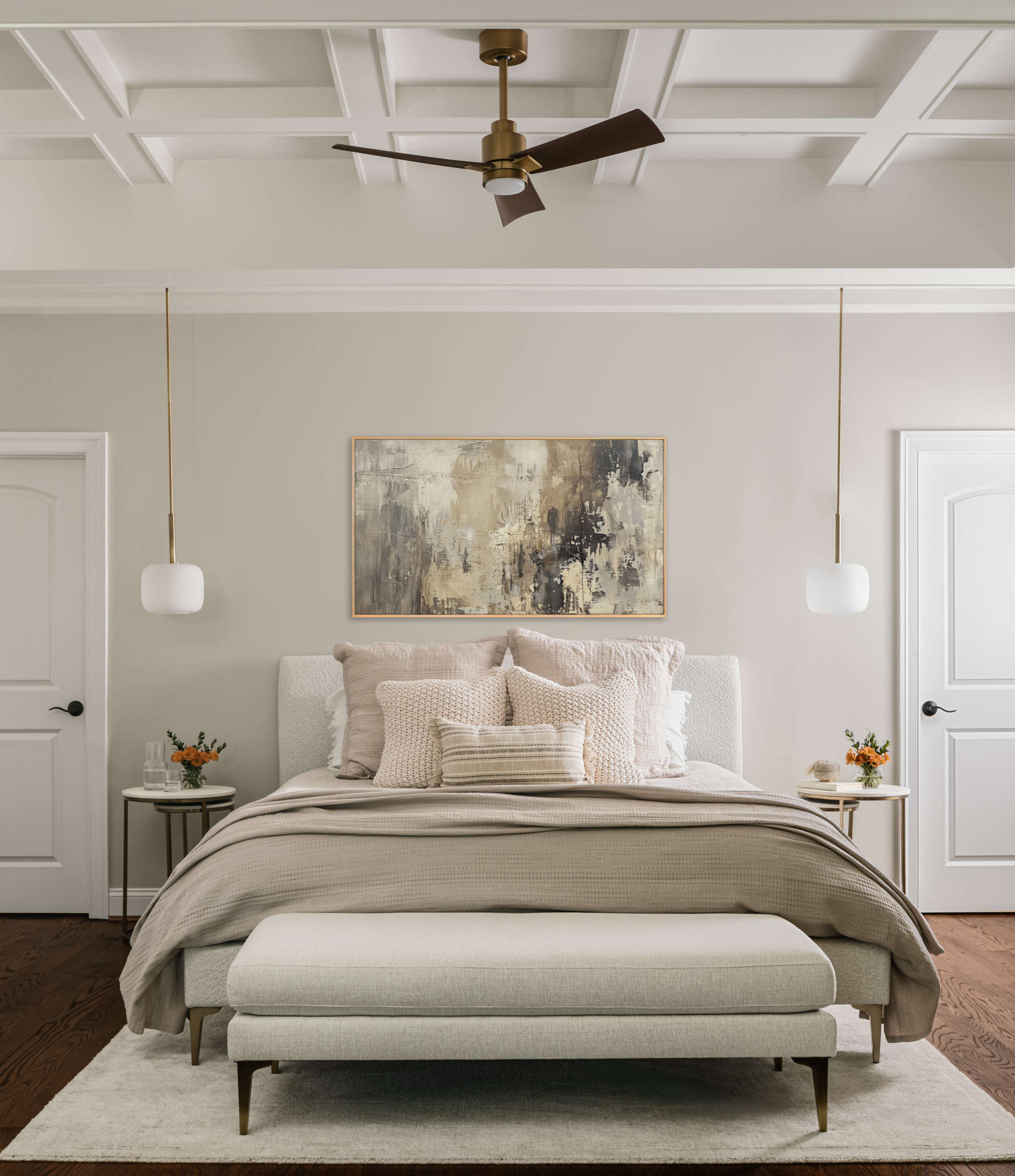 Following the principles of symmetry to a T, Ven Studio Architects designed this Washington, D.C.-area bedroom for utmost visual and physical ease. Even the door handles on the custom closets flanking the bed are mirror images. The rug, bench and artwork span both vertical halves of the design for continuity, and their progressively smaller widths create a pleasing balance. The design team nailed architectural interest too, creating a coffered ceiling that intrigues without overwhelming.