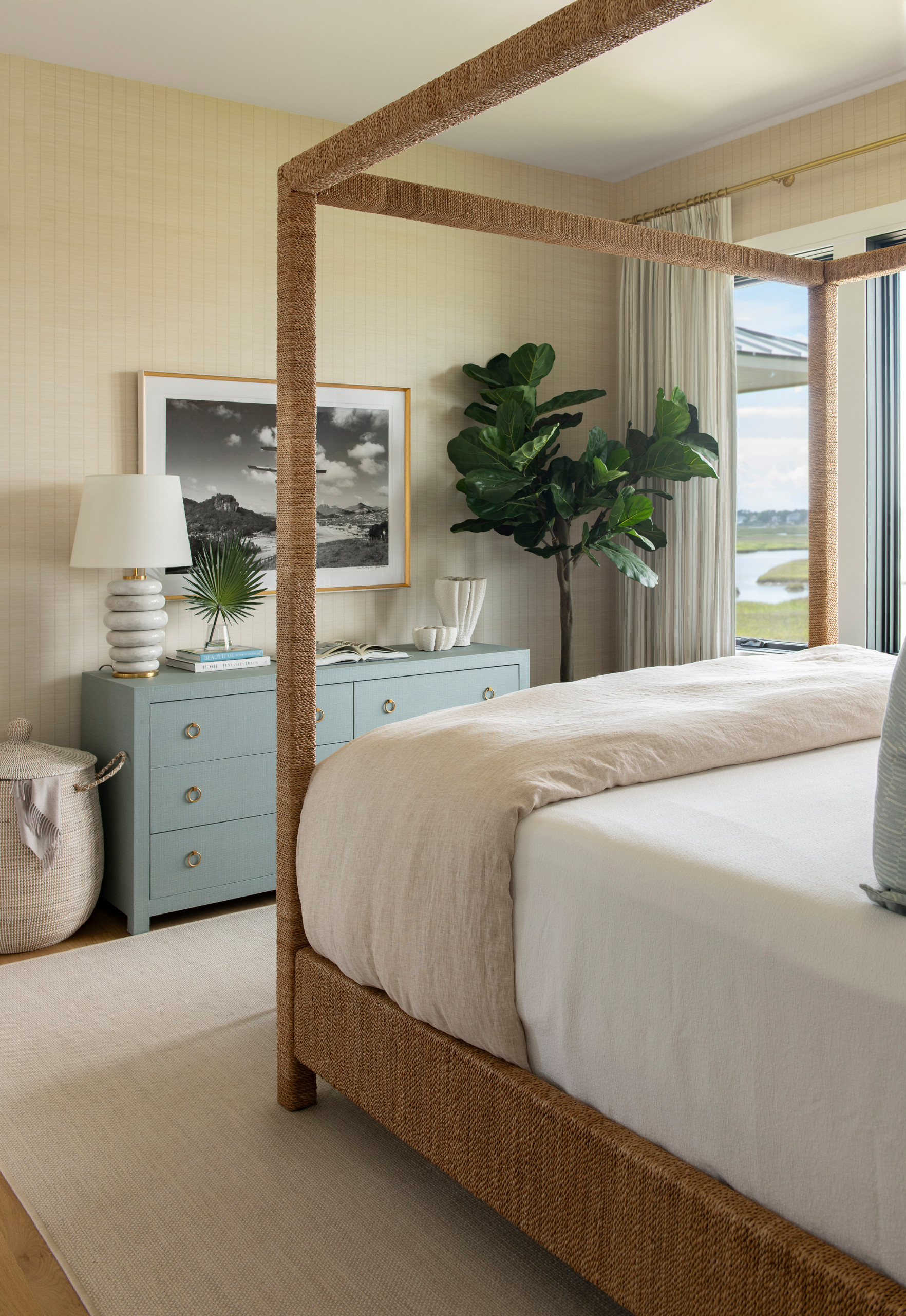 Although its casualness befits the North Carolina coastal location, this bedroom — in a home built by Konrady & Son Construction — still feels pulled together. That’s thanks in large part to a clean-lined dresser in a refined shade of blue with metallic ring pulls. The rest of the space has a beachy feel without a single conch or piece of driftwood in sight, courtesy of a bed frame wrapped in natural fiber, decor that nods to seashells, and greenery that doesn’t outcompete the water view.