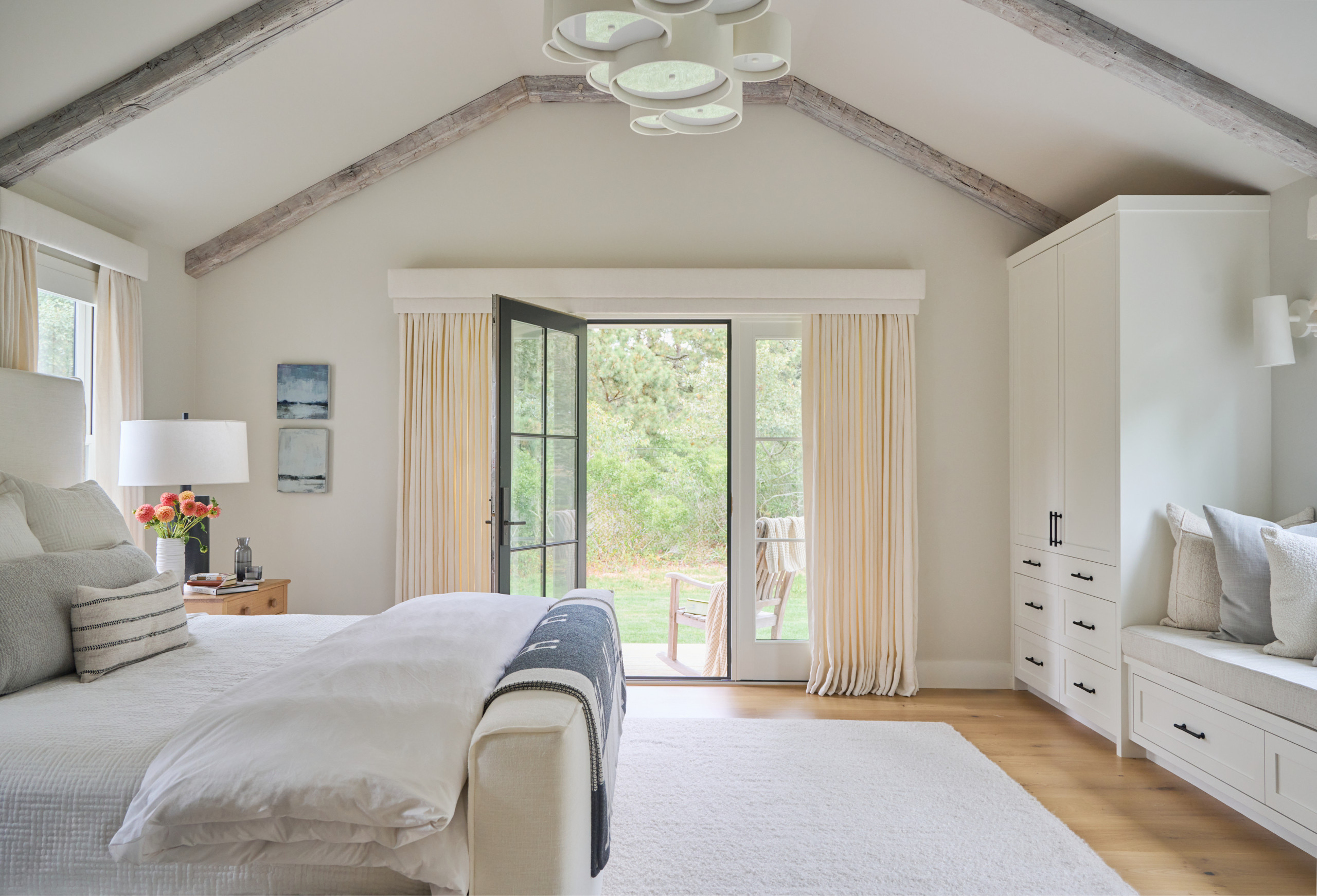 The gable ceiling with weathered exposed beams hints at the nature setting, and the patio overlooking an abundance of trees seals the deal. Done up in whites and creams with just a few dashes of ocean blue, this bedroom on Nantucket island in Massachusetts is an idyllic retreat from city life. The creation — from architecture firm S.M. Roethke Design and interior designer Nina Liddle — encourages plenty of daydreaming. Thanks to a French door, no one even needs to leave the bed for woodland inspiration.